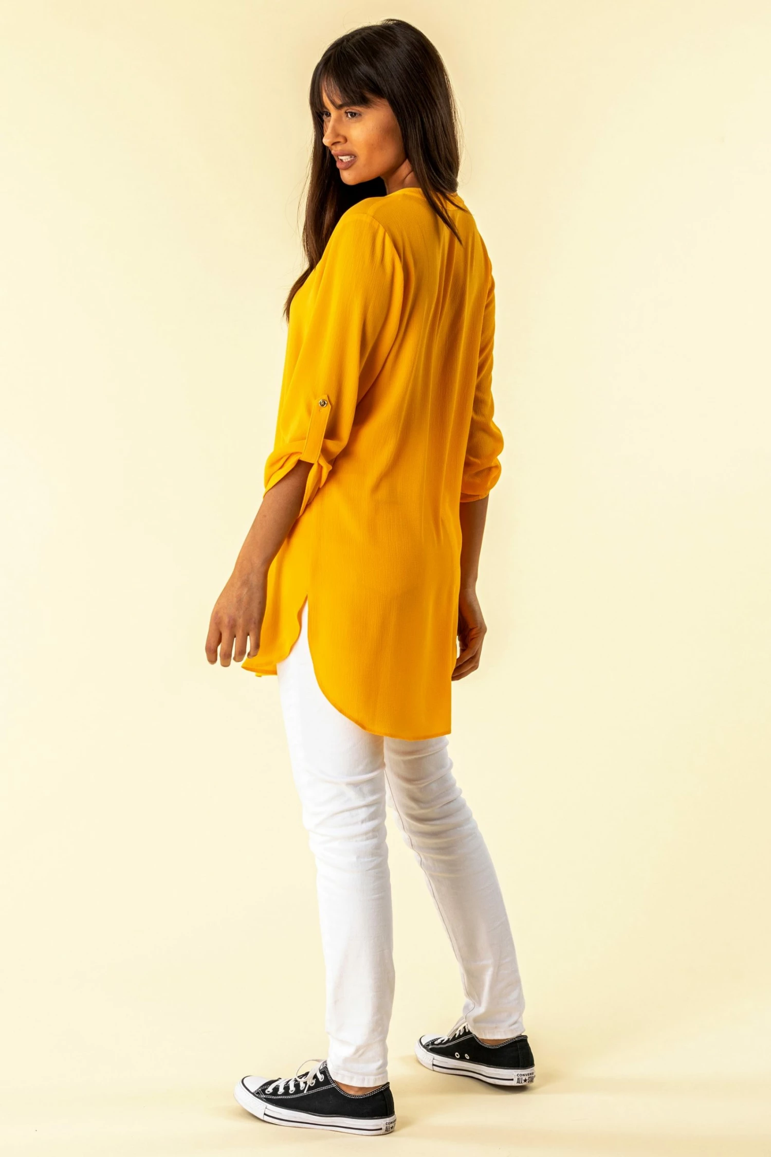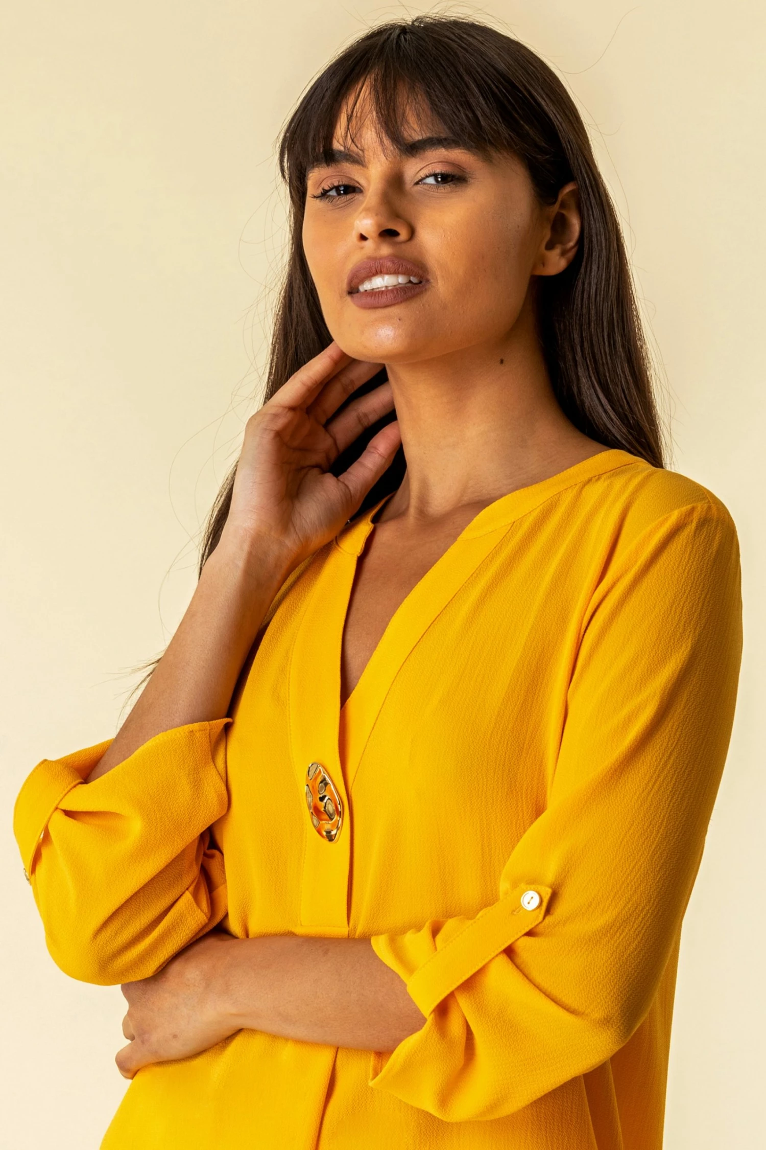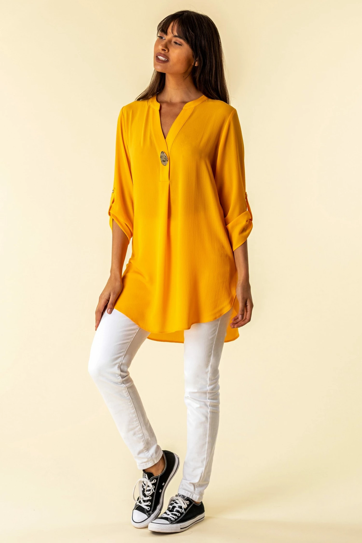 A sure fire way to inject some colour into your looks, this longline tunic top is sure to turn heads. Featuring 3/4 length sleeves, a flattering notch v-neck and one shiny button, this top is halfway between smart and casual. Dress it up or down to suit your occasion. Plain in colour but not in style, this vivid top can be paired with printed trousers to really make a statement or toned down with a blazer and trousers for work.