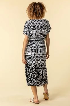 This dreamy shirt dress with vibrant Ikat style print will see you from desk to dinner with ease. The tiered midi shape is so on-trend, and the sweetheart neck lining gives an ultra feminine feel! Fully buttoned through, with a self fabric belt and long sleeves; this dress is crafted from a soft abstract print chiffon fabric. Throw on a pair of heels for an effortless evening look.