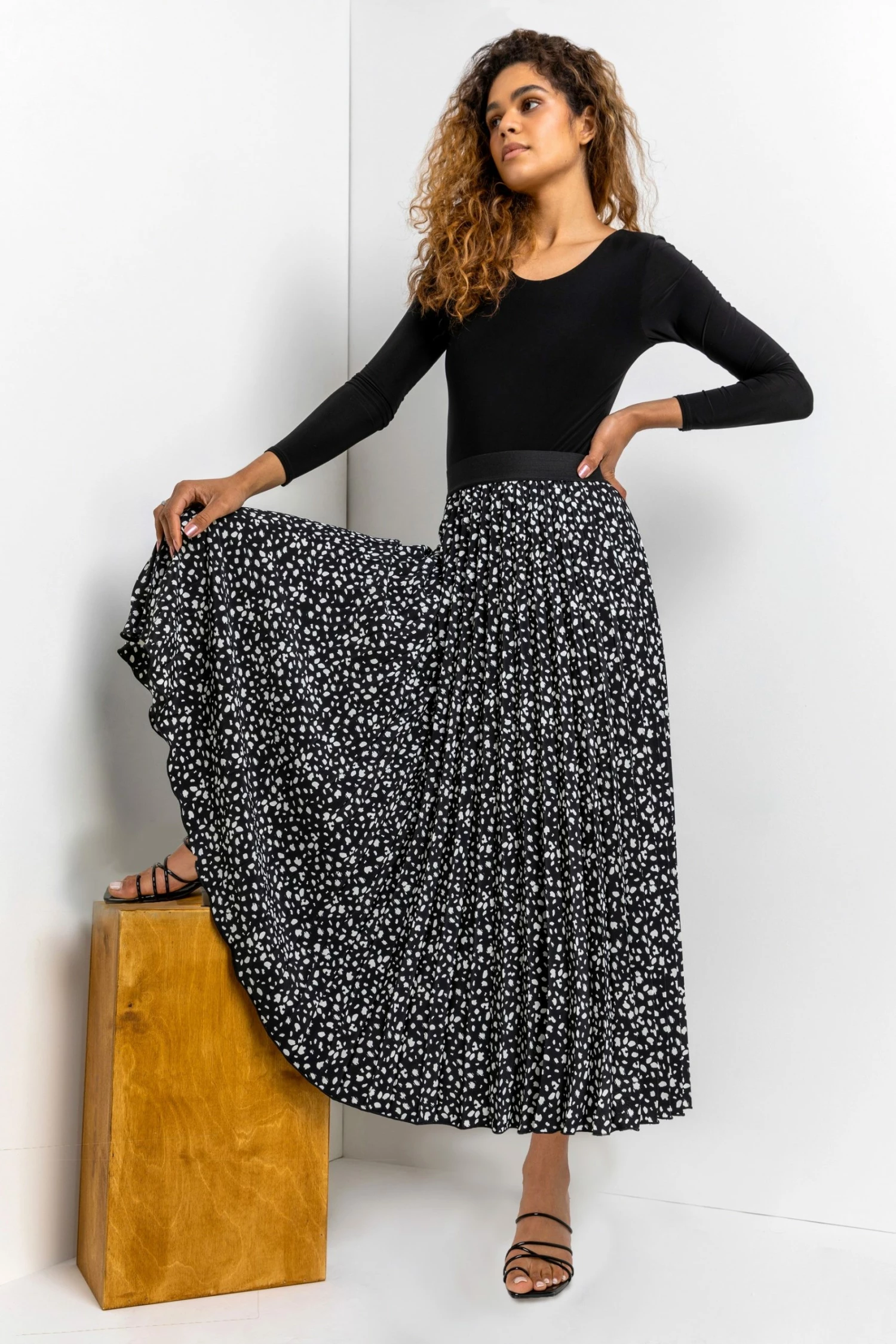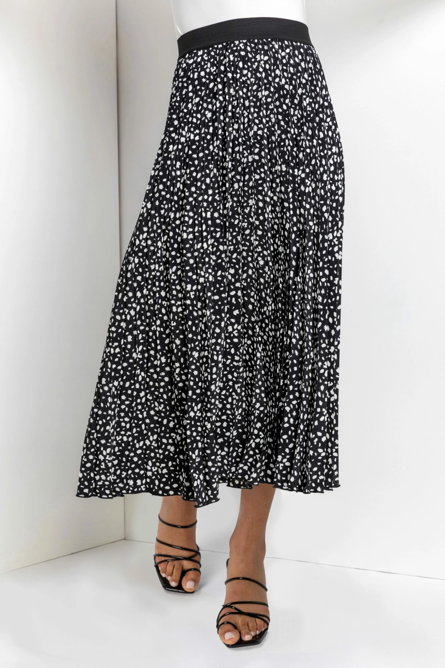 Embrace this seasonβs printed crush with this new pleated skirt. Featuring an elasticated waist, this abstract spot printed skirt will add dimension to any outfit. This playful pleat trend is perfectly paired with a simple t-shirt or cami for a quick on the go yet stylish look. Worn with trainers to heels, this maxi skirt is versatile in style and adaptable for a multitude of occasions.