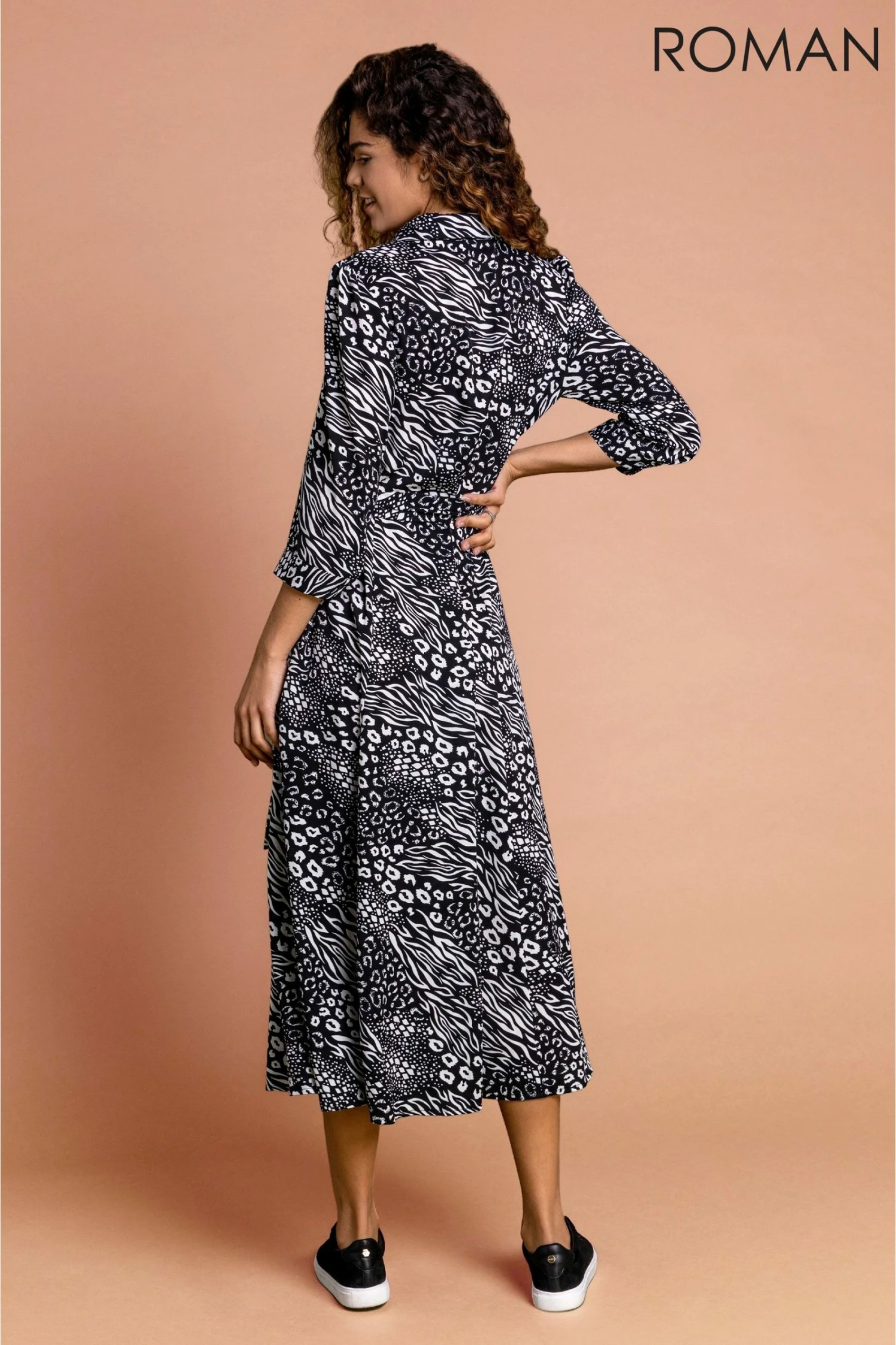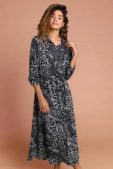 Keep it simple with this smart button through shirt dress. Finished with a shirt collar and button-down fastening, this mixed animal print day dress is effortlessly stylish for everyday wear. A fabric tie belt cinches in the waist and creates a flattering fit with this demure midi length and a-line silhouette. Style this wild print with pumps and a leather jacket for fashion forward daywear or dress it up with heels for dinner.