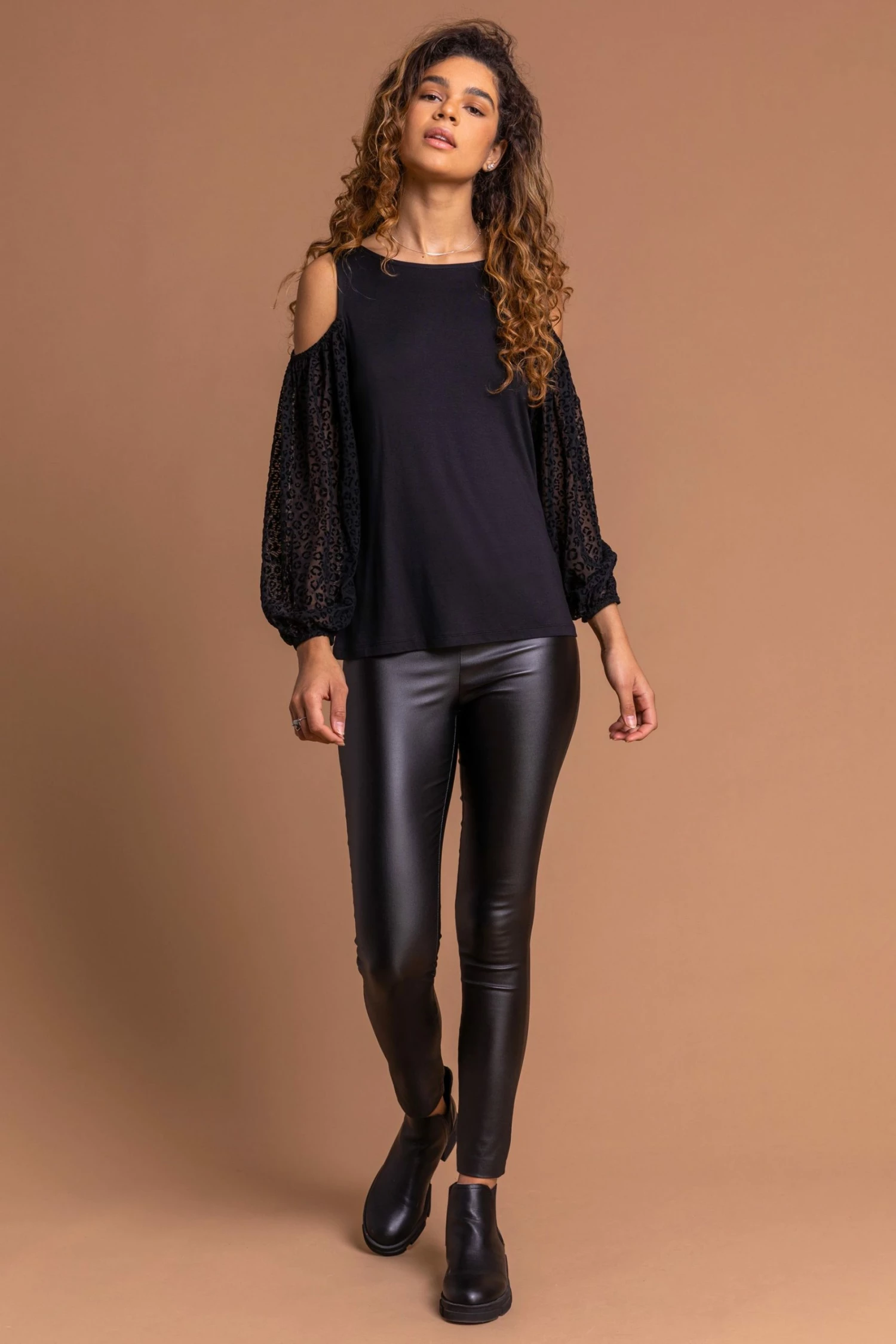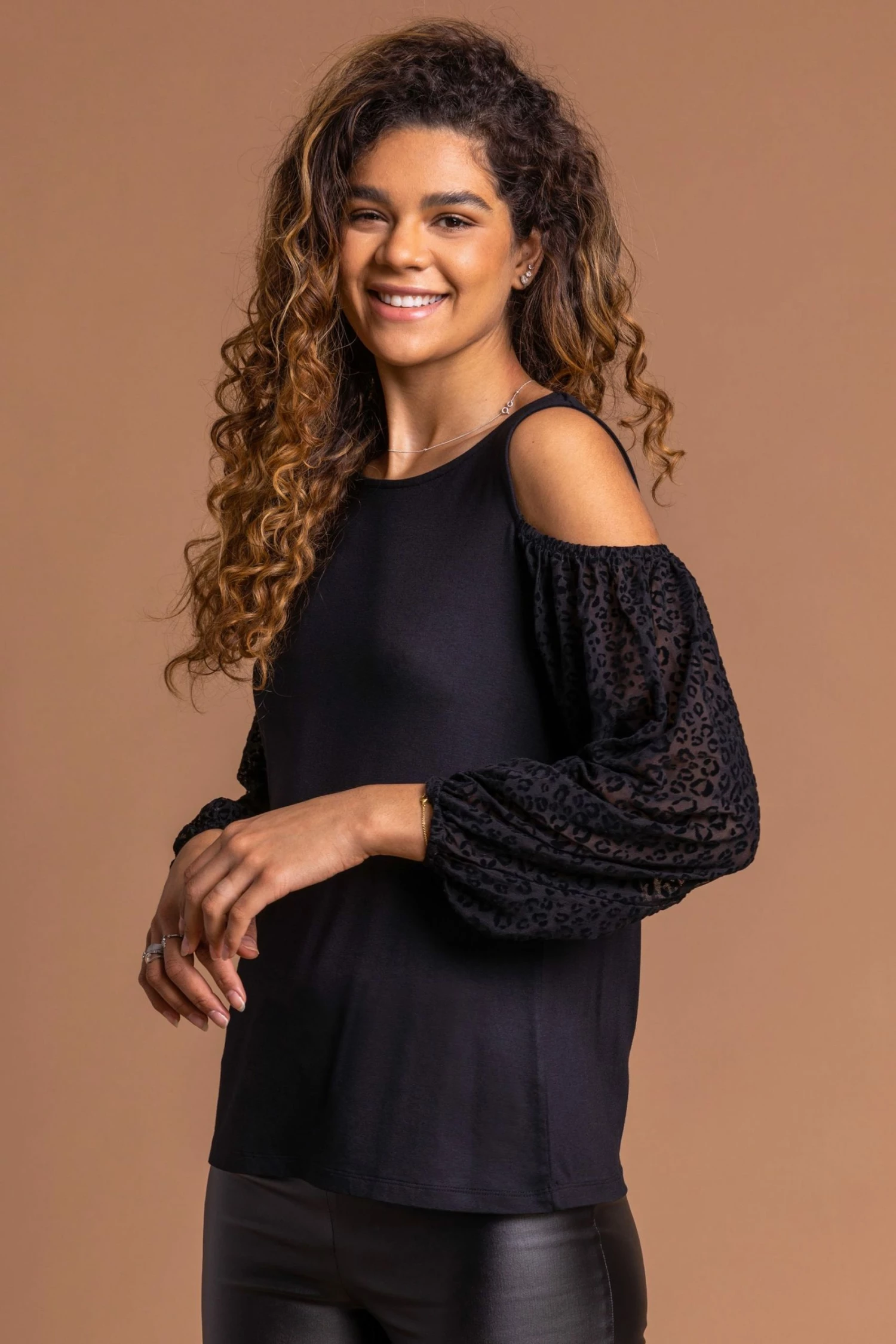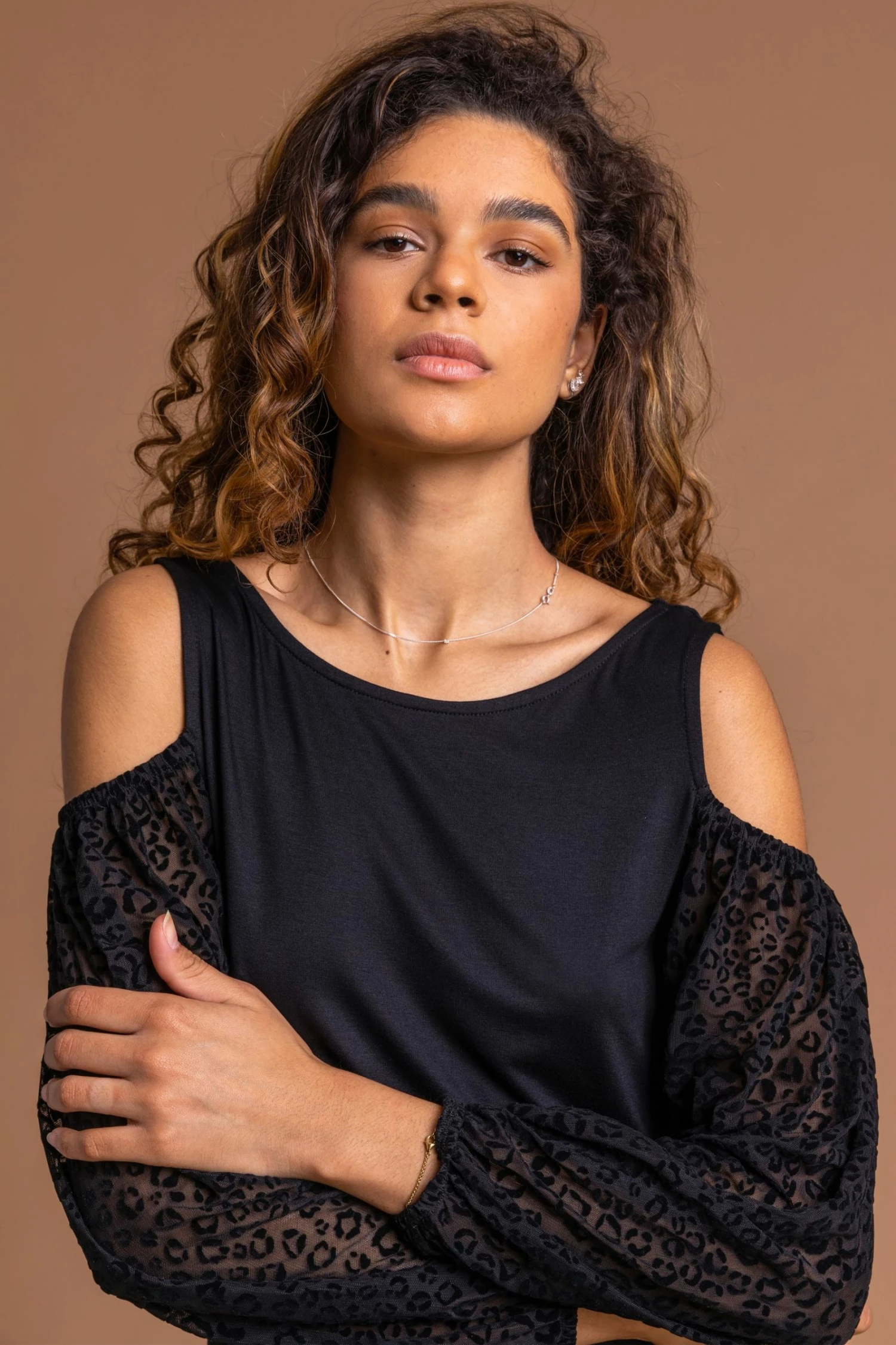 Update your party collection with this stunning mesh sleeve top. Cut from a kind to skin jersey that is easy to pull on over the head, this stylish little black top has a contrast animal print sleeve in a flocking design that is oh-so-stylish! The round neck number also has elasticated cuffs to finish the long sleeves with a bit of comfort and flair! Dress this up with faux leather leggings, heels and a clutch for a night on the town.