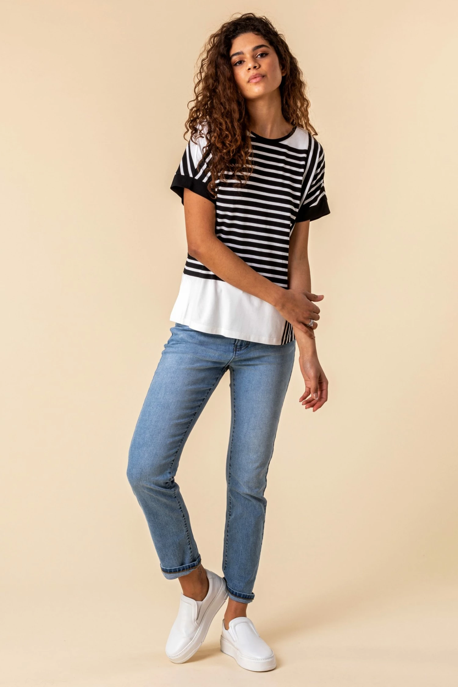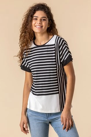 Take your casualwear to the next level this season with our panelled stripe print top. Featuring a dropped shoulder and bound crew neck for comfort. Finished with a panelled front adorning a contrast stripe to the plain fabric. Pair with cropped culottes and trainers for a casual look to take you anywhere or with skinny jeans and boots for a more dressed up outfit choice.