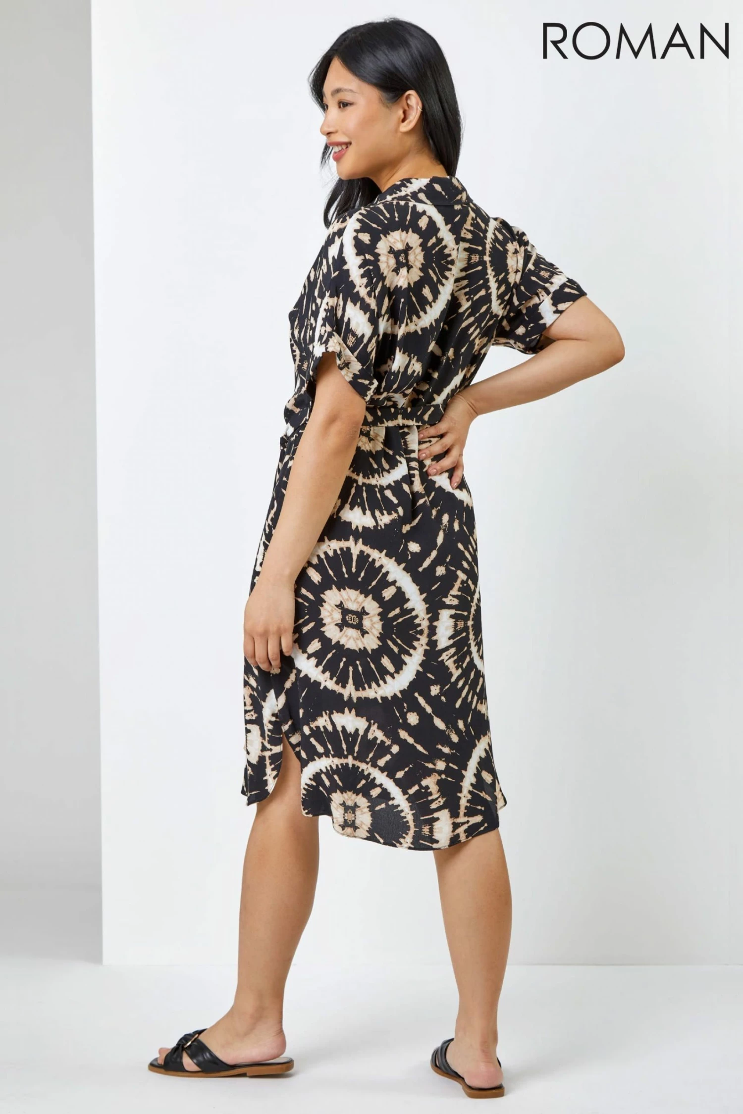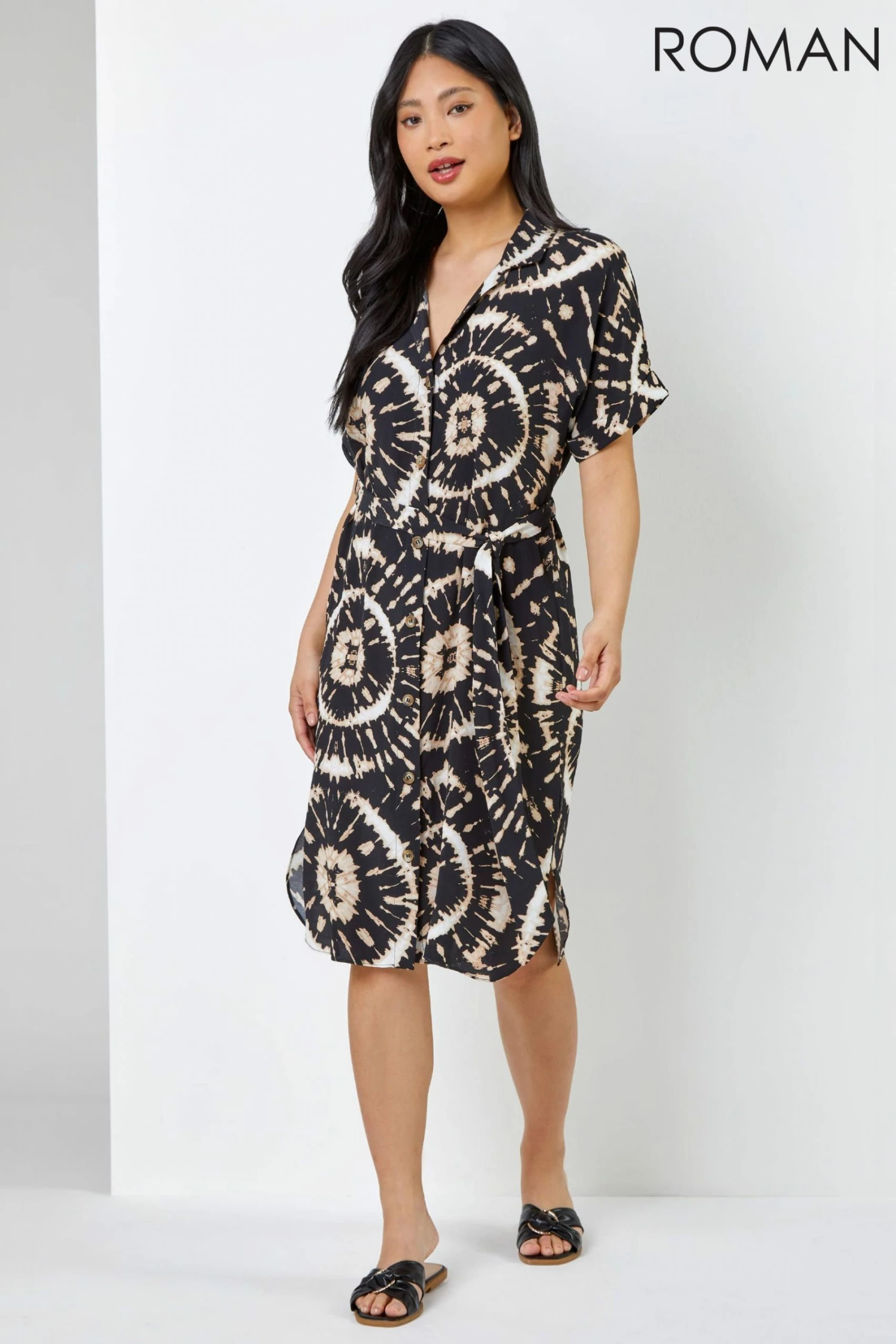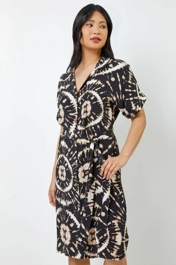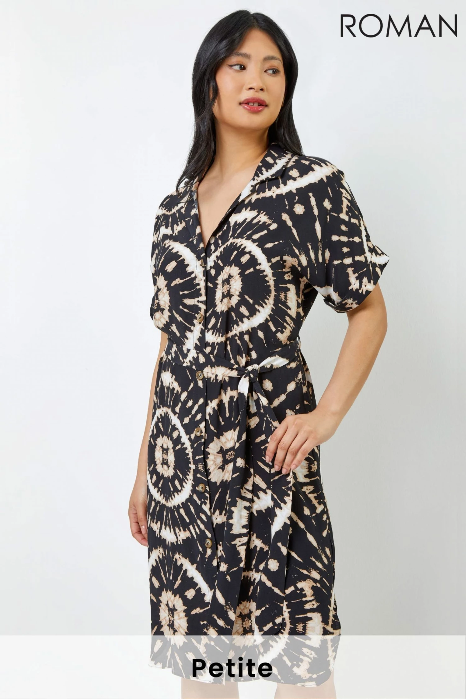 Adorned in the print of the summer, tonal tie dye. This bold new shirt dress has a smart collared neckline and loose button through shape that is so easy to pull on and go. The short sleeves and v-neckline are so easy to wear through the warmer months and can be styled in so many ways with the fabric belt tie detail. An edgy shirt dress for those off-duty days, you can pair this Petite number with a denim jacket and flats for a cool spring day look.