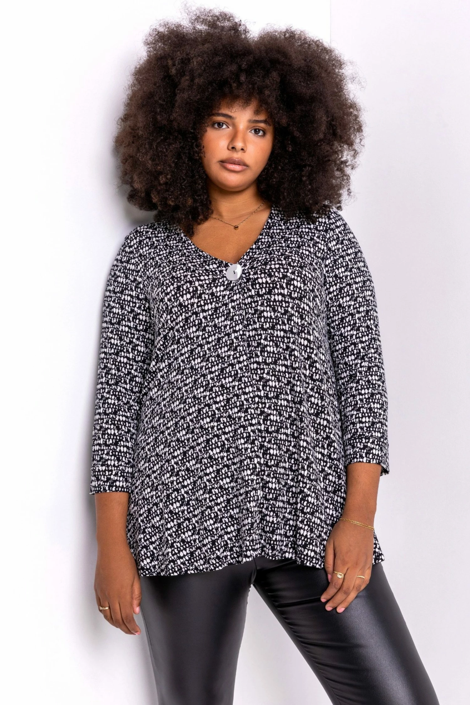A chic addition to Roman Curve, this floaty smock top is so easy to wear. Effortlessly styled with a metallic button detail, this blouse has a flattering swing shape that does not cling to the body. Our softest jersey style is finished with a v-neckline, 3/4 length sleeves and cuffs for the ultimate smart casual staple. Pair this with faux leather trousers for an evening dinner date or dress it down for a casual style with a pair of jeggings and pumps.