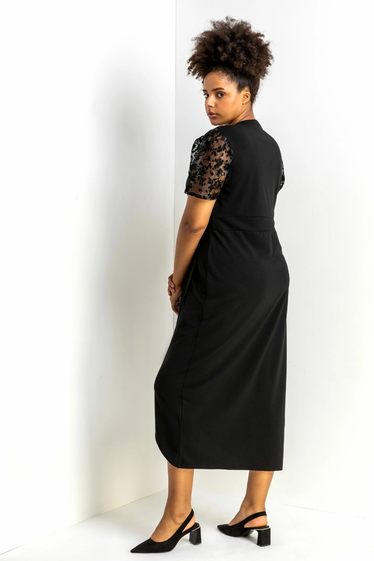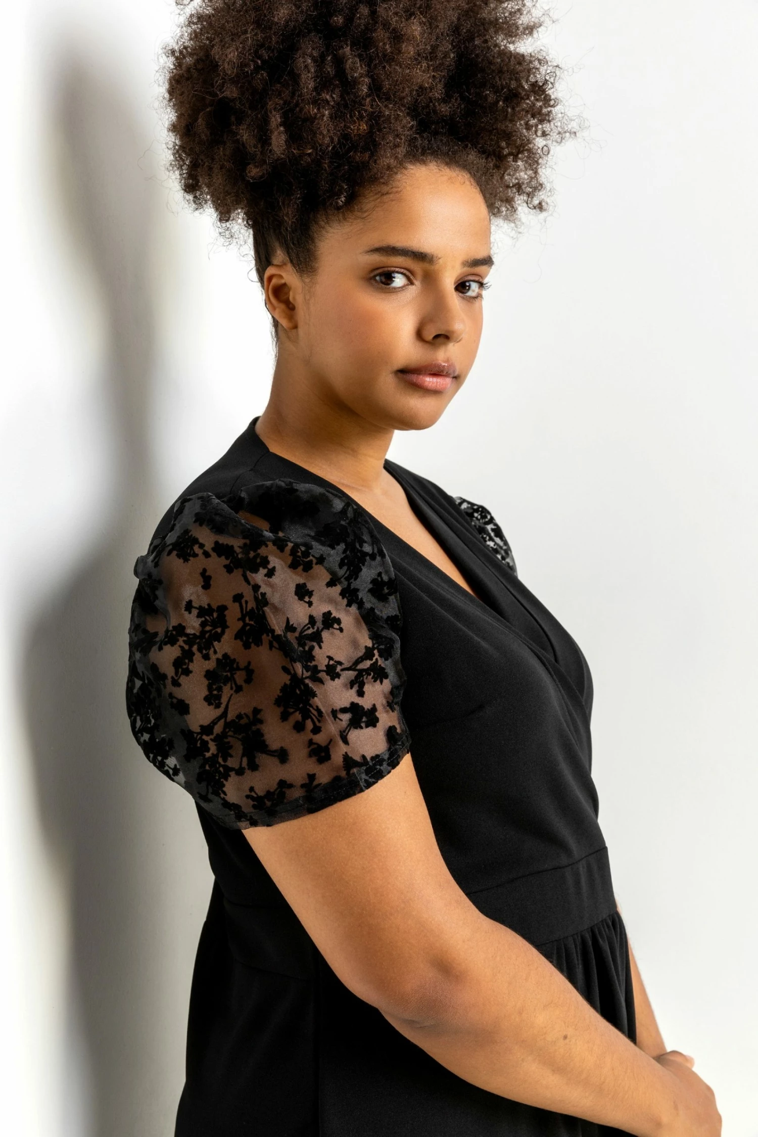 Take your style game to the next level with this elegant Roman Curve organza sleeve detail wrap dress. Cut to a flattering midi length, this pretty evening dress is fashioned with a light v neck, waist band and short puff sleeves made from a organza fabric adorned with textured applique fabric. Team with a statement necklace and heels for a sophisticated and show-stopping evening look.