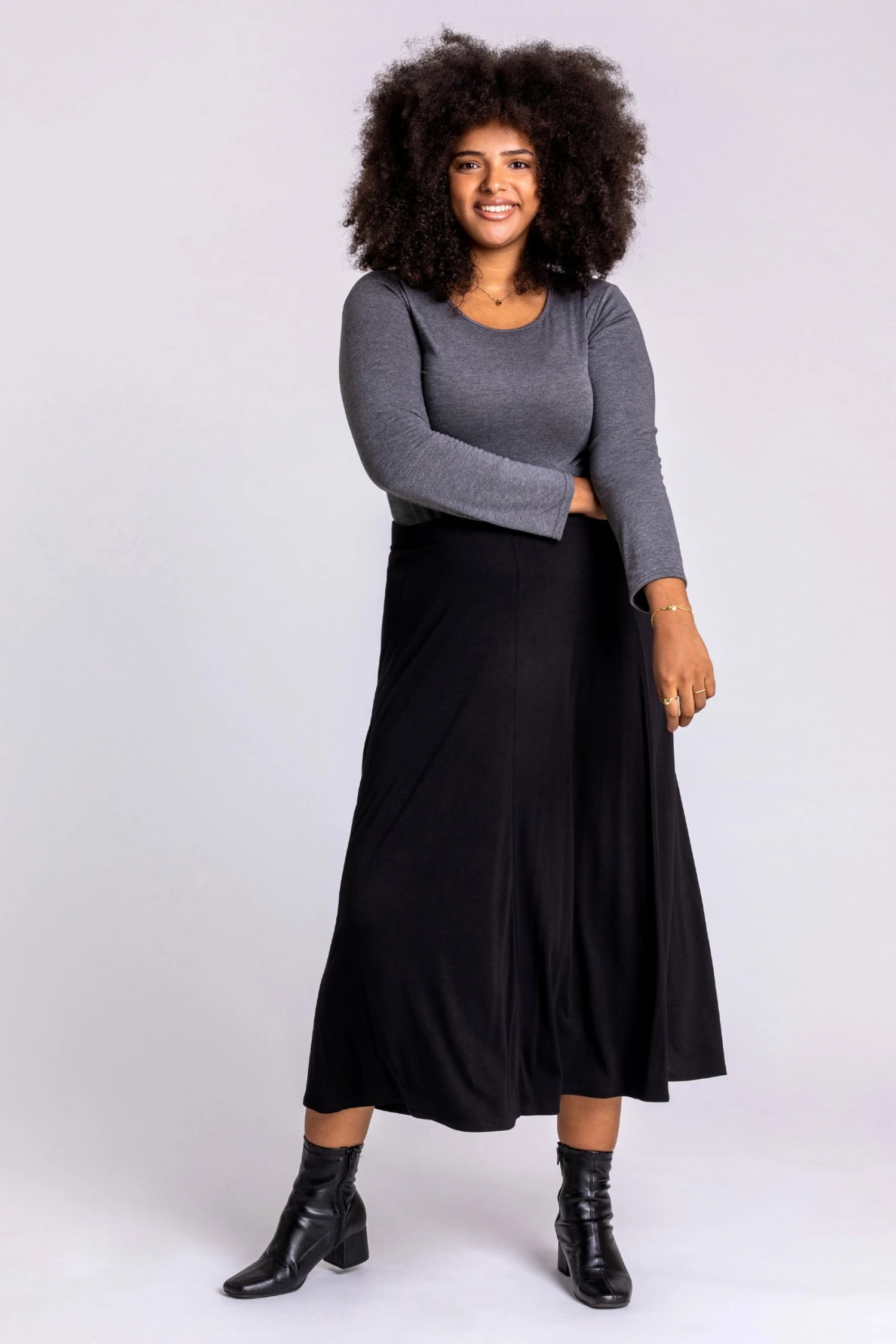 The ultimate wardrobe essential for all year round, this multi paneled midi skirt is a go to for any occasion. With an elasticated waistband and stretch jersey fabric, this skirt can be worn in a multitude of ways, from workwear to a night out on the town it s the ultimate versatile skirt.