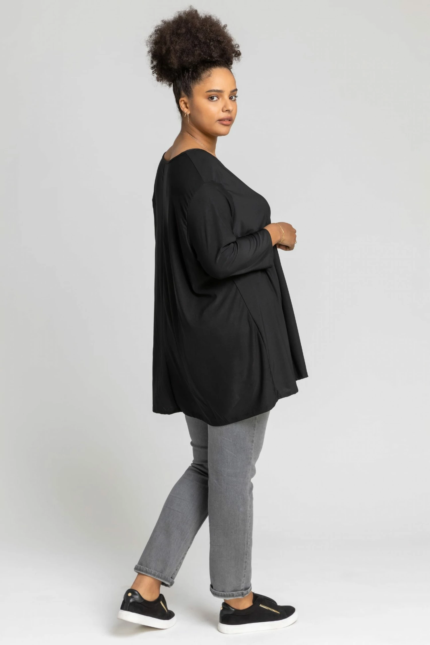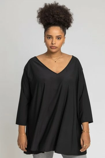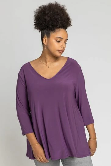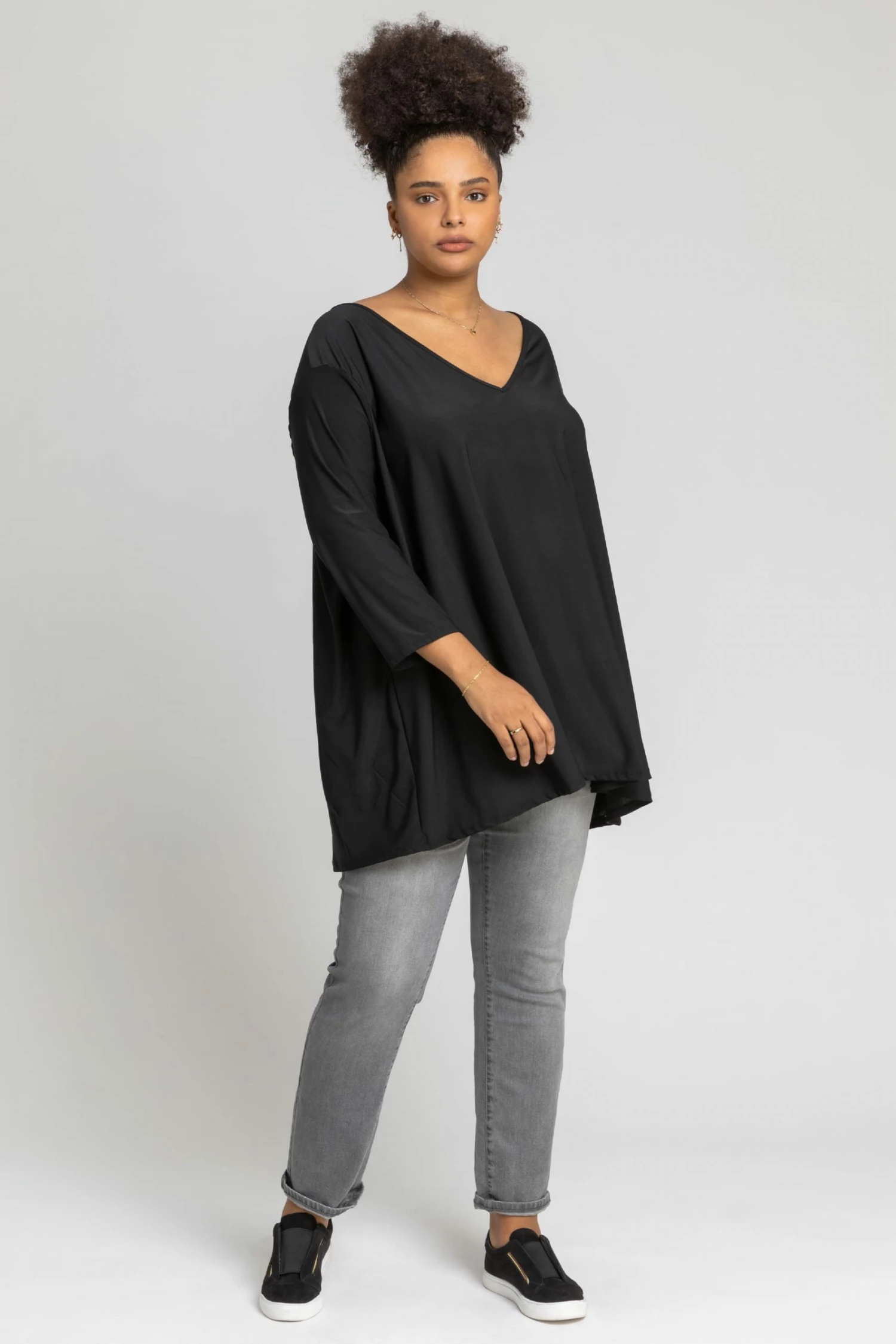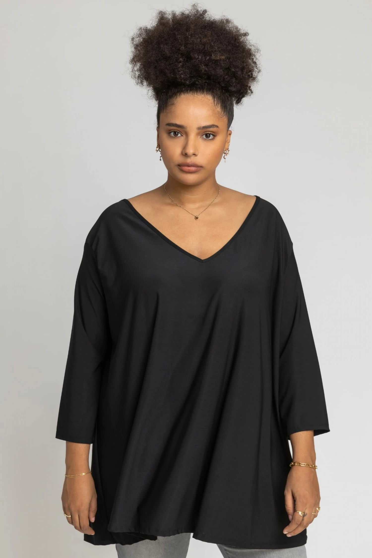 This slouchy oversized style is a real wardrobe winner! Crafted from a slinky stetch jersey that is easy to pull over the head, this plain tee can be tucked into fancy skirts for an instantly stylish casual look. This v-neck top has 3/4 length sleeves and a flattering swing silhouette that creates a feminine flow to your look. Add some sparkling jewellery and faux leather pants for an easy evening ensemble for those last minute plans!