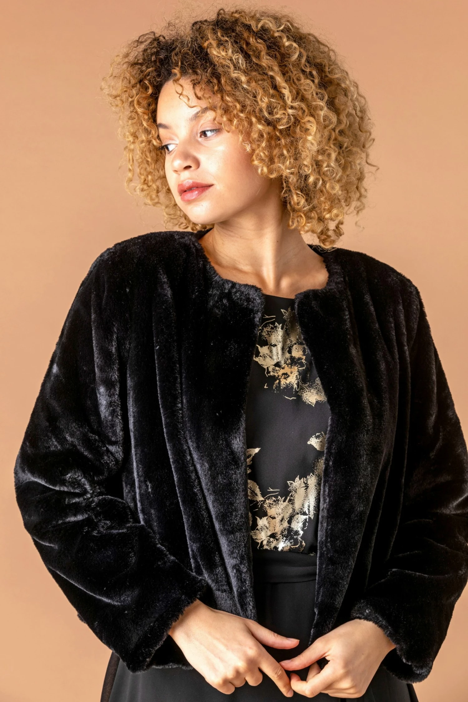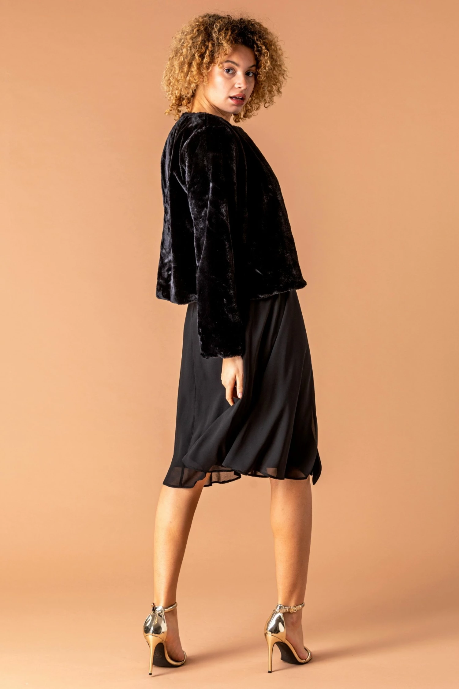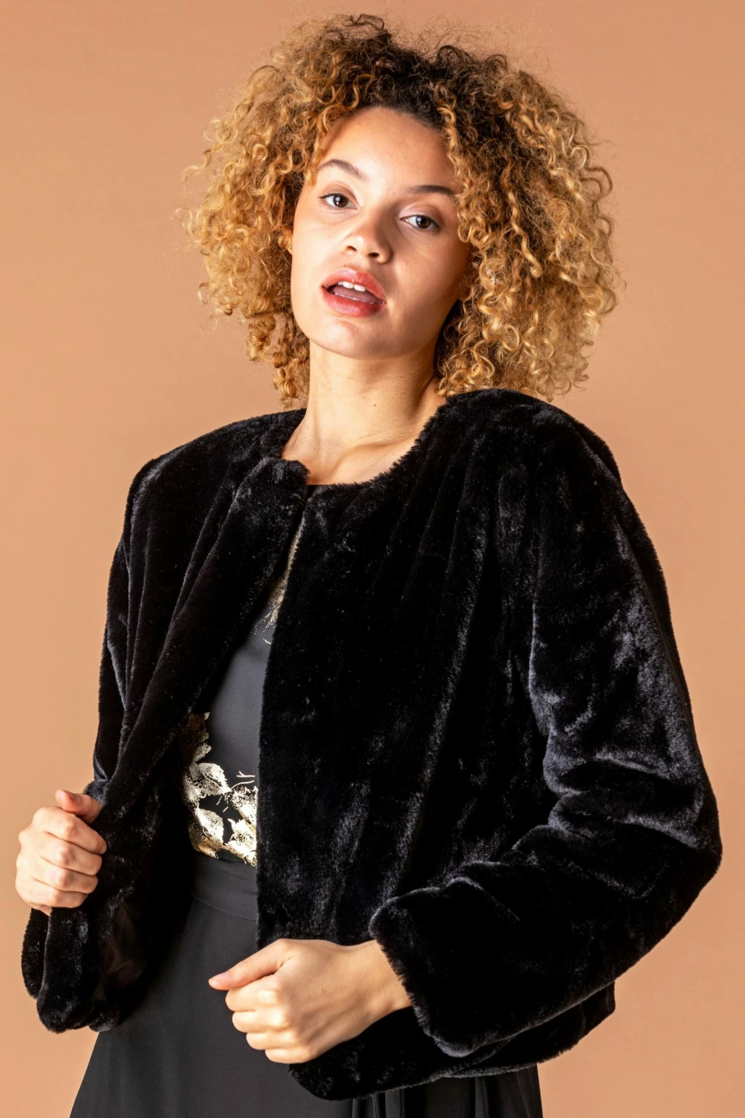 Add a touch of elegence to your special occasion looks with this luxe faux fur cropped jacket. Crafted from the softest faux fur, this jacket has long length sleeves and an open edge to edge front, making it perfect for throwing over your most glamorous evening dresses. This plush autumn winter staple is sure to become a favourite in your formal wardrobe.