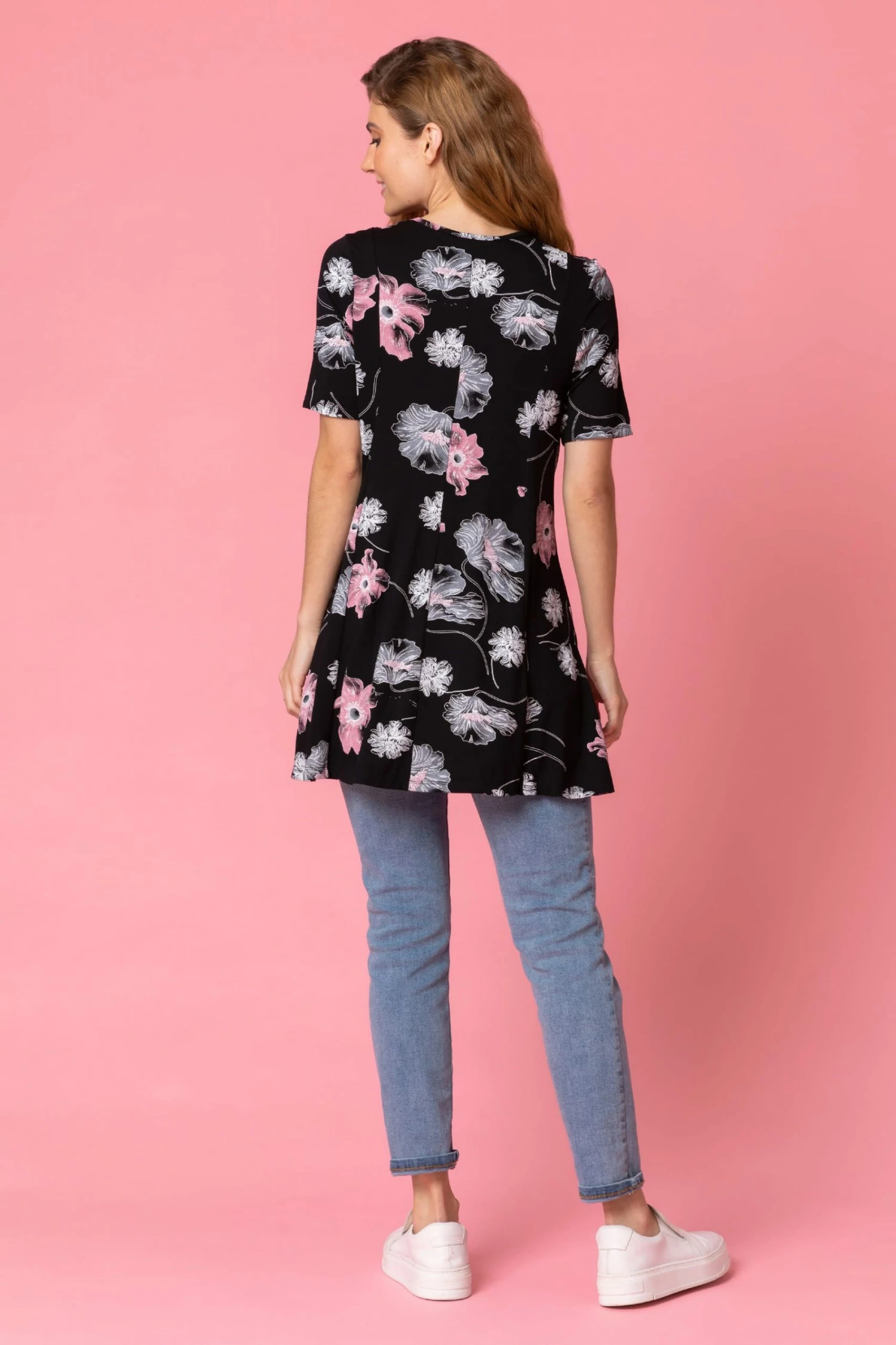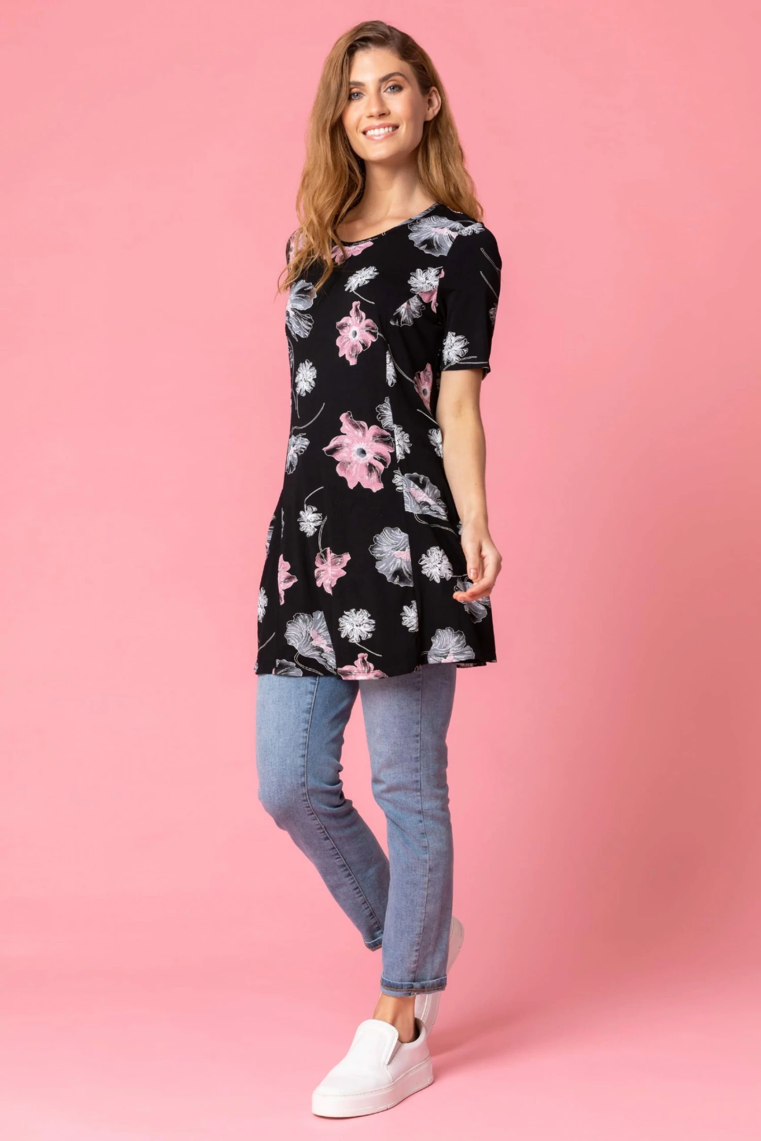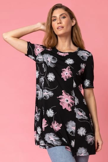 With a sweet floral print, this comfy jersey top is perfect for spring summer weather. Finished with short sleeves, front pockets and a round neck, this top also has a floaty hemline and a loose fit swing shape that adds a unique finish to a wardrobe favourite. This floral print tunic can be dressed up for work with smart trousers and heels or dressed down for the weekend with jeggings and trainers.
