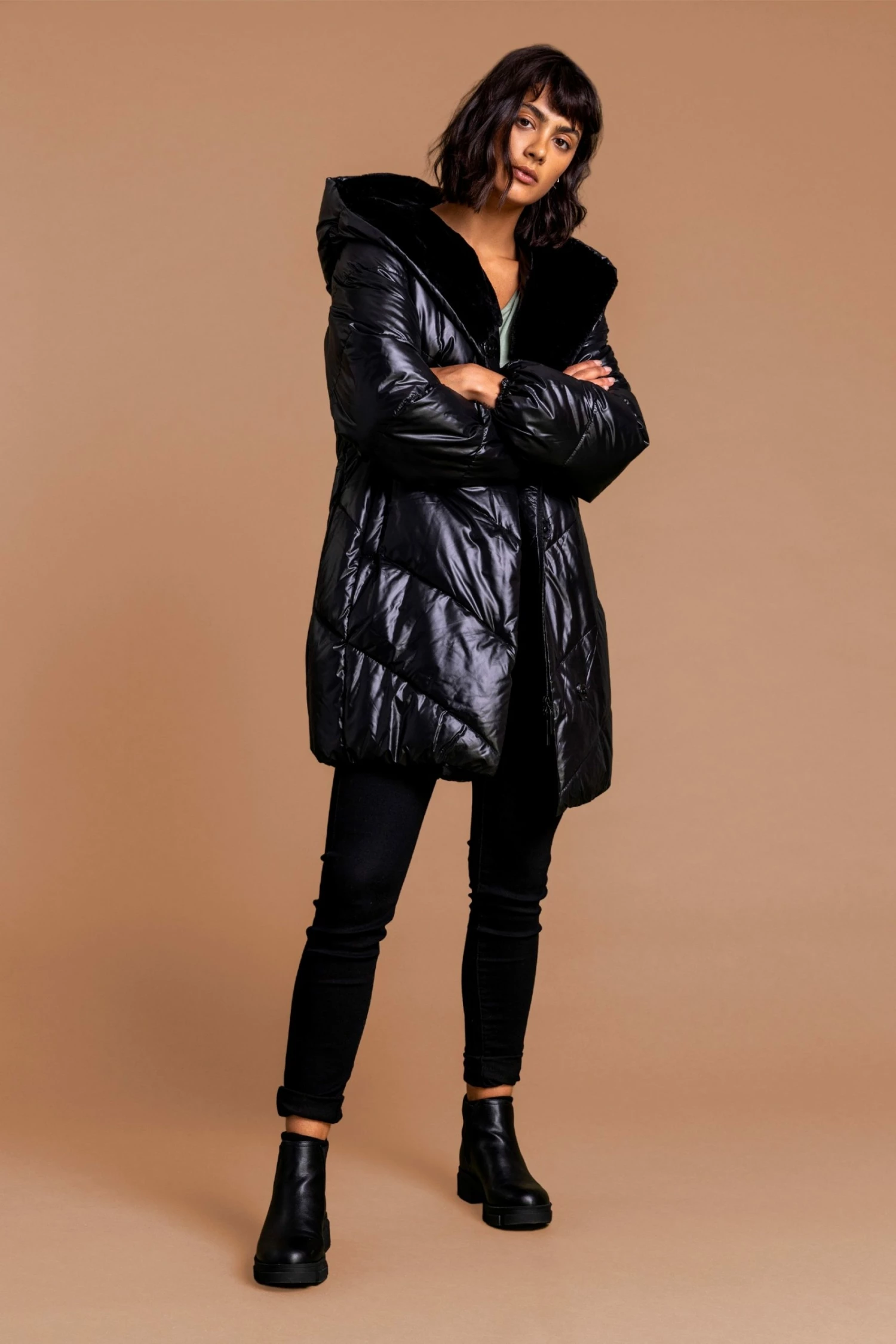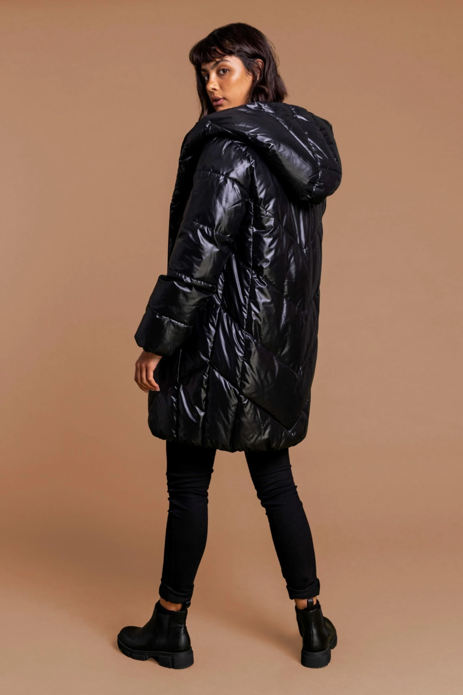 Make sure you are wrapping up in style this autumn-winter season with our wet-leather-look padded coat. This longline puffa jacket has a zip and popper fastening with elasticated cuffs and a faux fur lined hood to keep the cold out. Crafted from a fashionable quilted fabric with a sheen, this on-trend piece can be worn with your casual everyday outfits or dressed up with your faux leather leggings and heels.