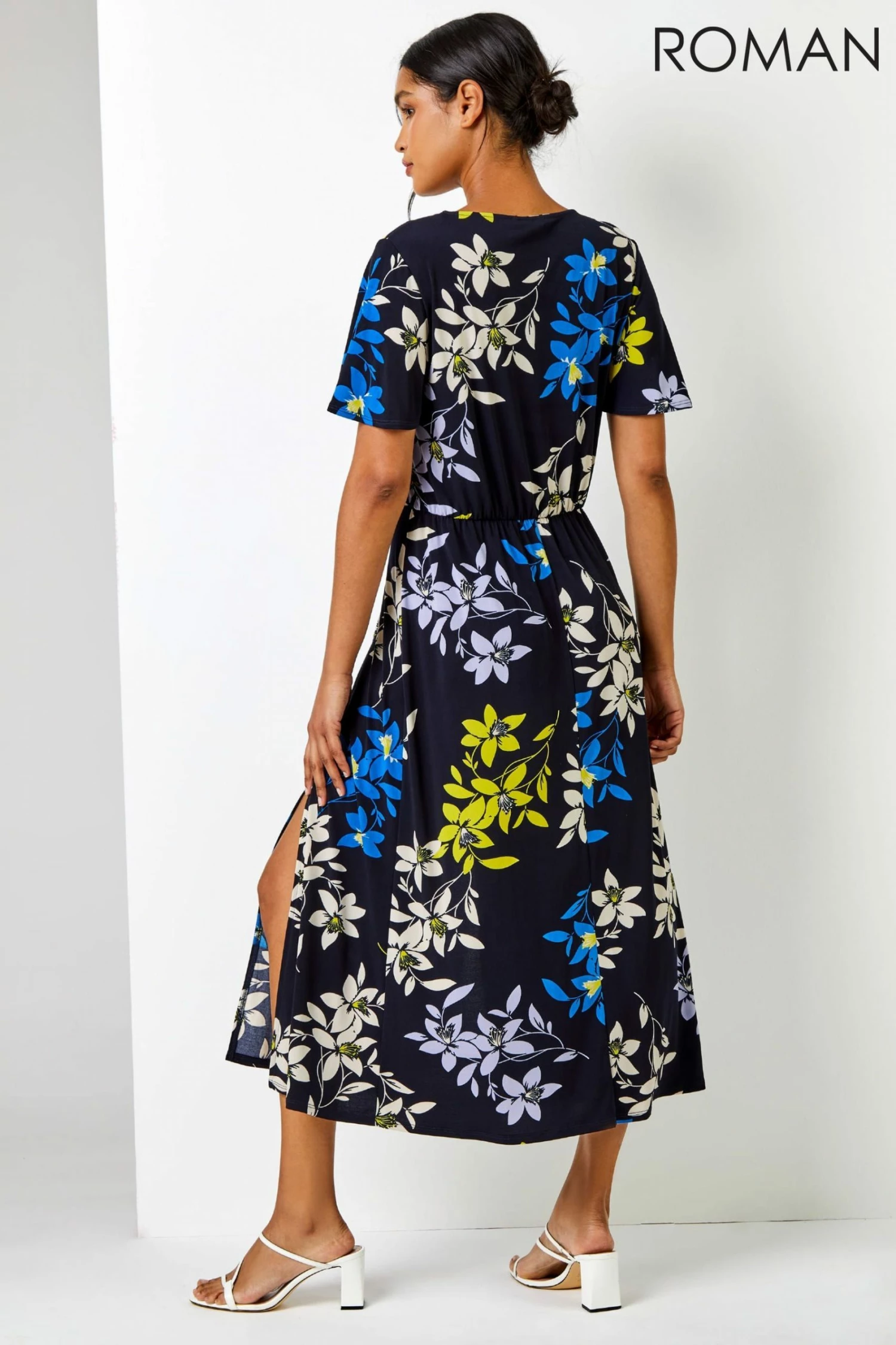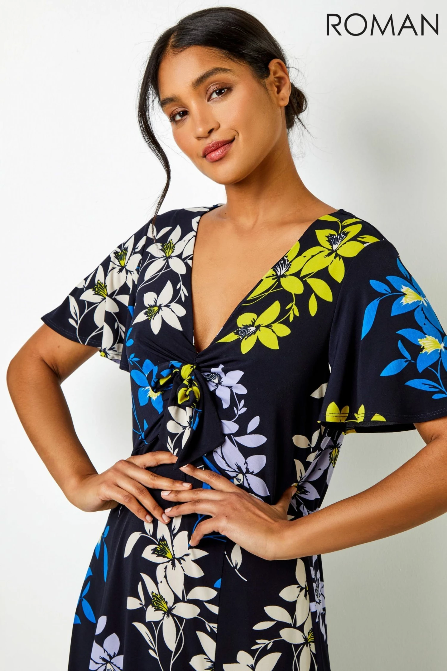 Add to your floral collection this season with a beautiful summer dress, taking you from occasions to beach holidays within seconds. Cut to a relaxed fit and flare shape made from soft stretch jersey material, this maxi dress features a tie detail on the bust and empire line with short angel sleeves, flowing into a maxi length skirt that is designed with vertical panels with splits, creating the ultimate flattering silhouette. Wear with your summer sandals and sunglasses for an effortless holiday outfit.