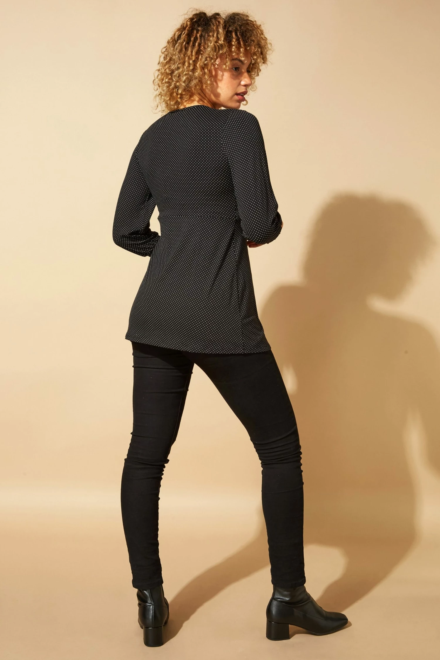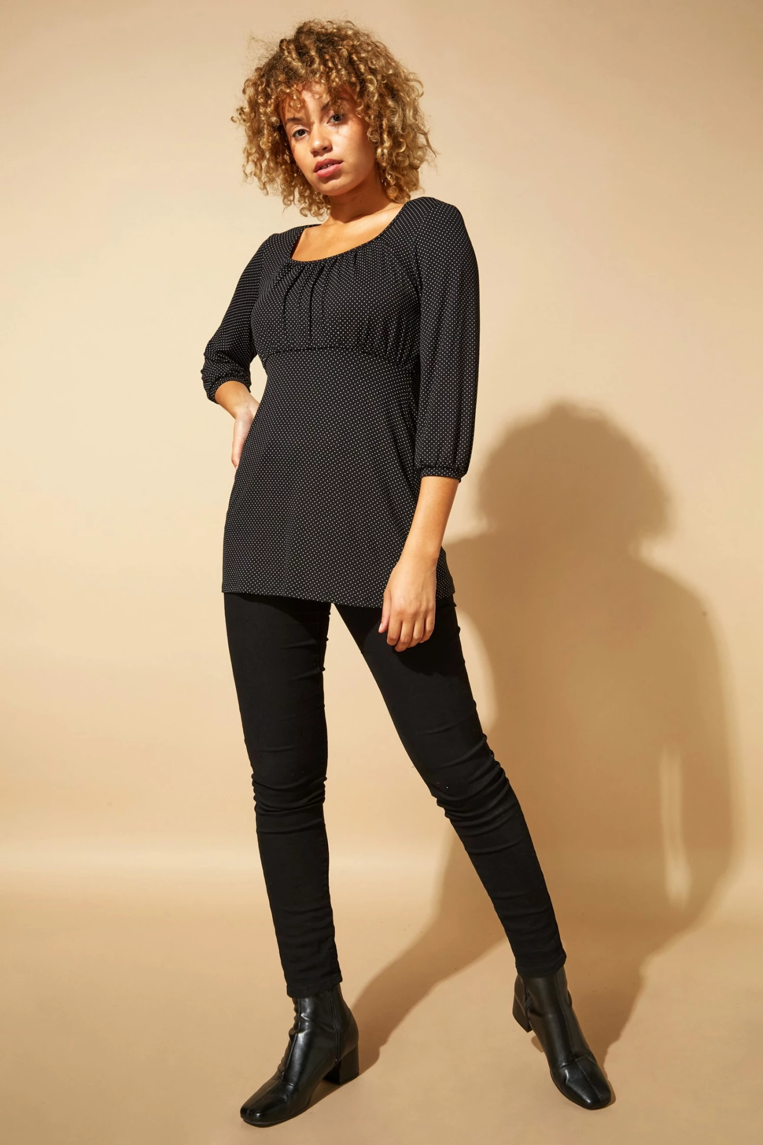 Go dotty for this polka dot print top and turn heads throughout the autumn season. This pretty top features three quarter length sleeves, a scoop neckline and gathered bodice with pleat detailing. Fitted at the bust and flaring out from the waist, this comfortable stretch jersey top is finished with a ditsy spot print and is both flattering and versatile for everything from work to weekend. Team with smart black trousers and contrasting heels for a chic vintage inspired look.