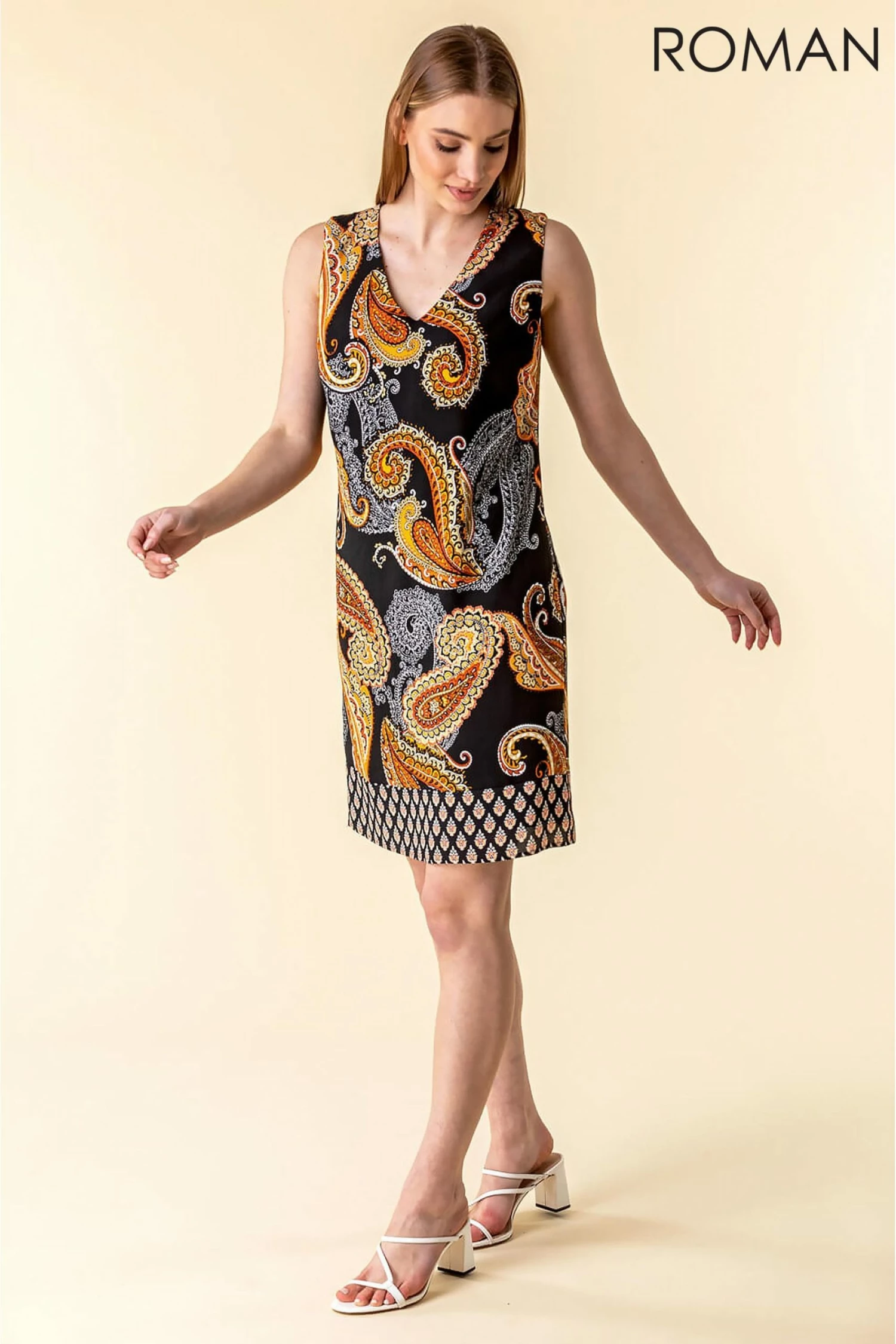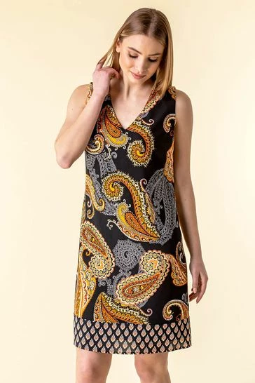 Shift over autumn/winter and bring on spring/summer, with this beautiful bold paisley print v-neck dress. Featuring a bold print with a contrast border and sleeveless design, this shift dress has a full lining with no fastenings making it an easy fit to pull on/off. Wear with your sandals or flip flops at the beach or dress it up with wedges and a cardi for the evening at the bar.