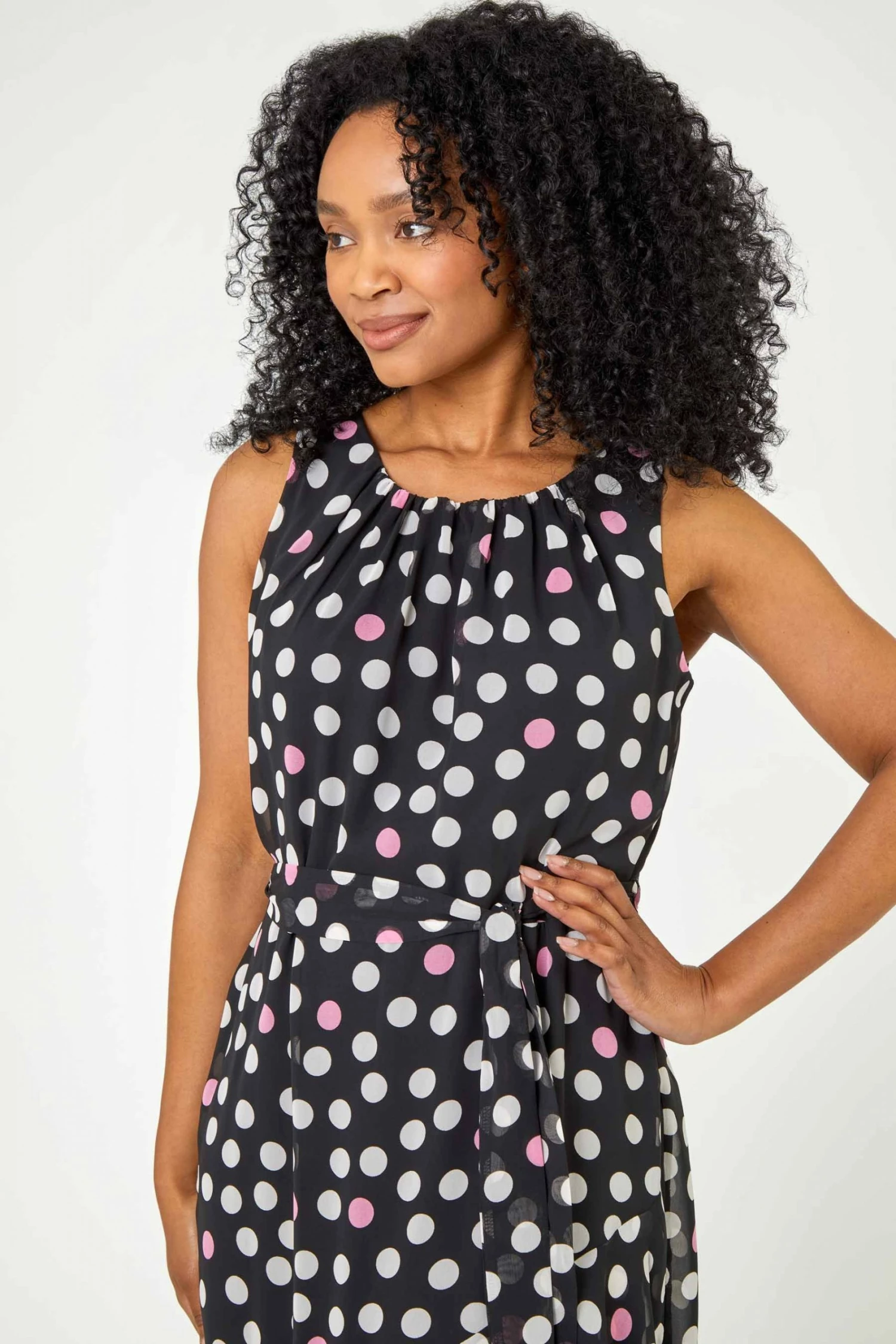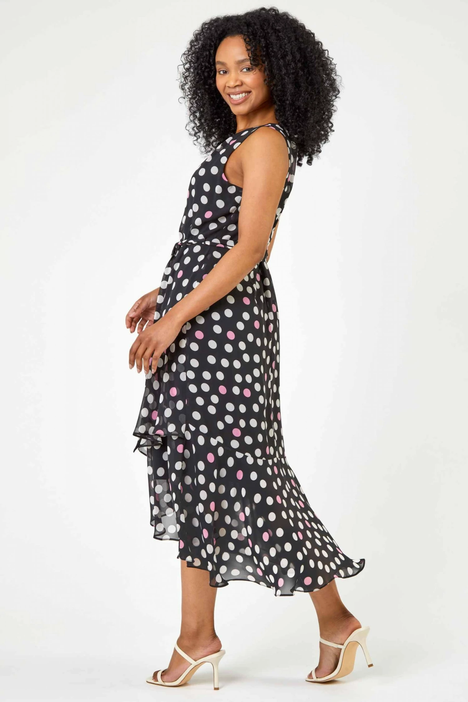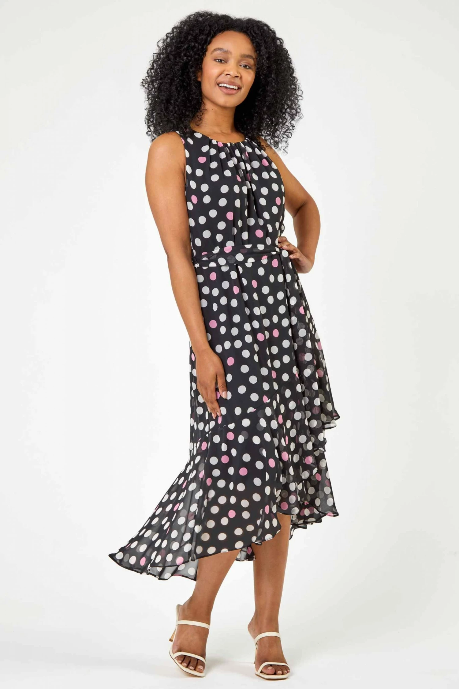 Be the belle of the ball at your Summer events with this polka dot print empire line dress. Cut to a classic fit and flare shape with an added flouncy hem, this frill detail dress will add a pop of colour to any occasion. This spot print has us dreaming of sunset dinners on holiday with its soft hues and sleeveless shape. Style with an ivory jacket and fascinator for a sophisticated day at the races.
