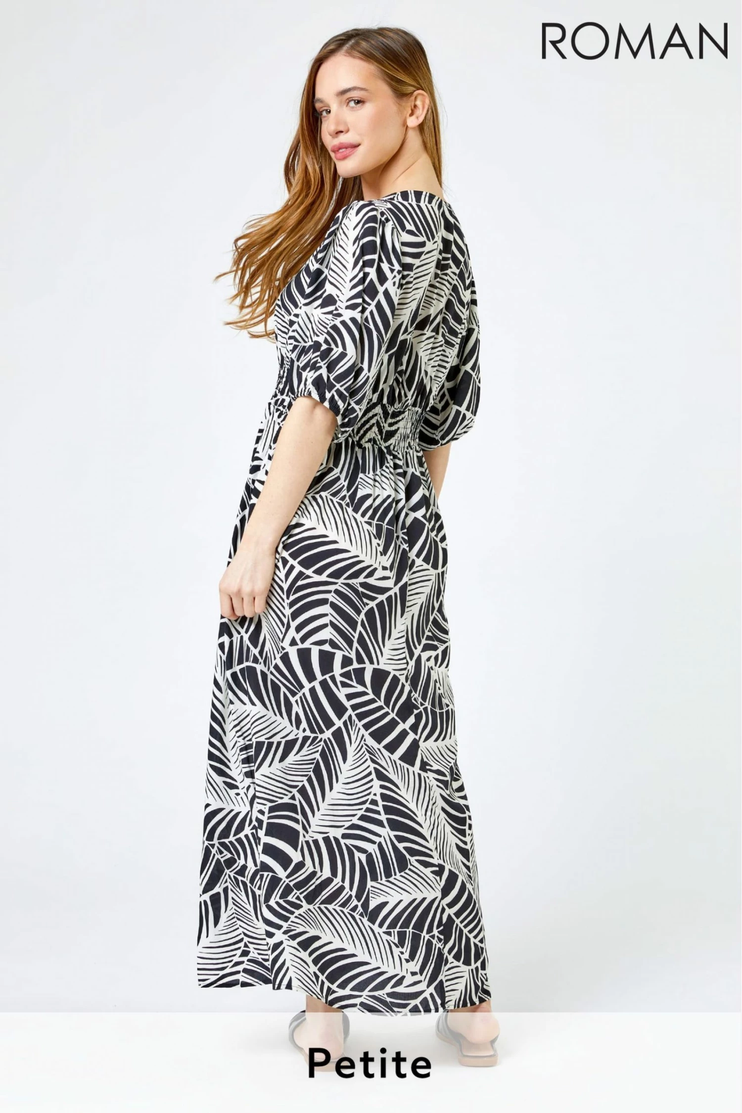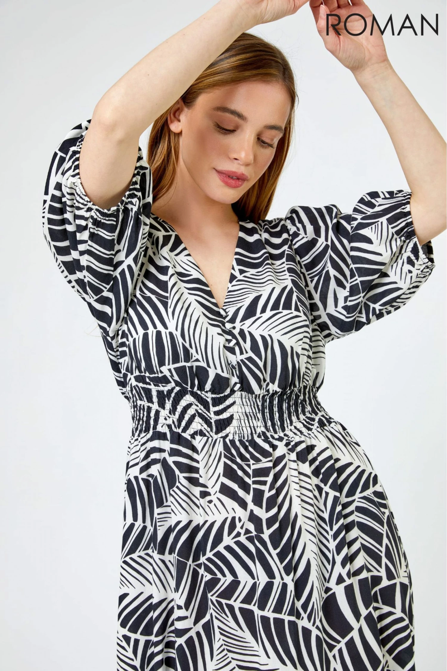 Giving us tropical vibes! We will be living out this season in this monochrome tropical v-neck maxi dress. Made with short elasticated sleeves and a button down front, this dress has a beautiful shirring effect to the waist, creating a feminine silhouette. Pair with your everyday flats and a cardi for a daytime outfit, or dress it up with statement jewellery and sandals for a refreshed and breezy look.