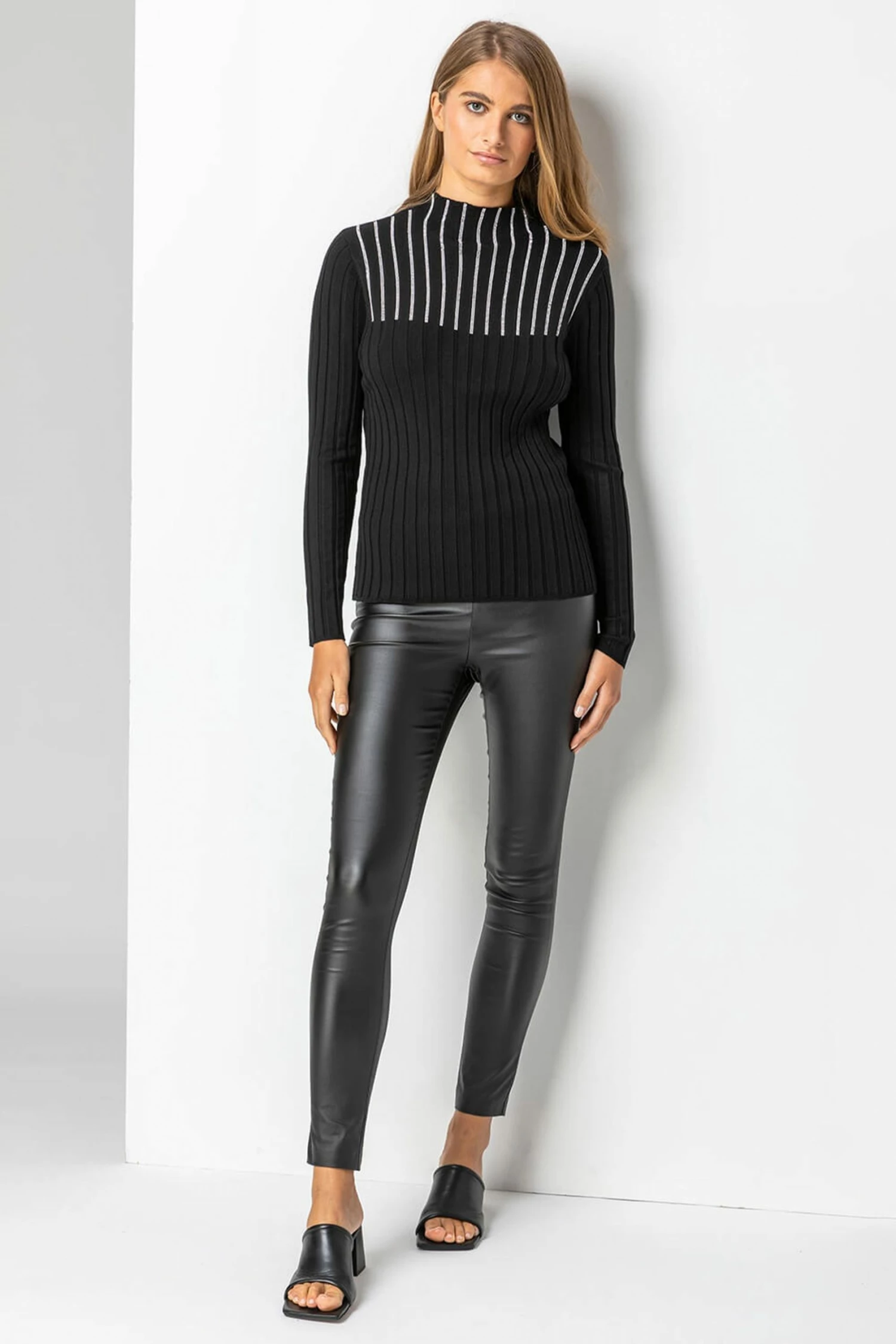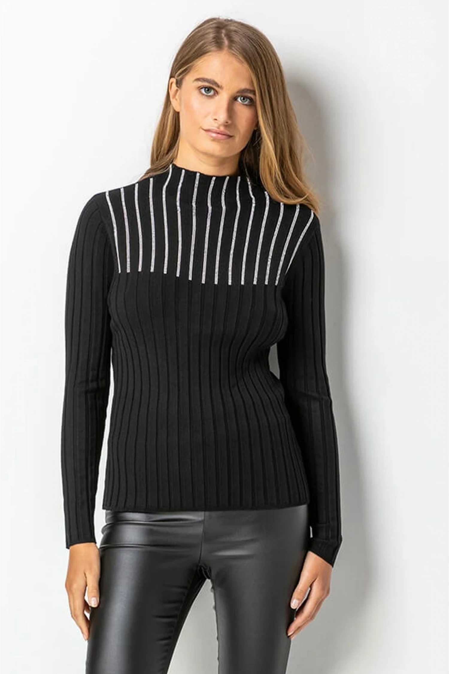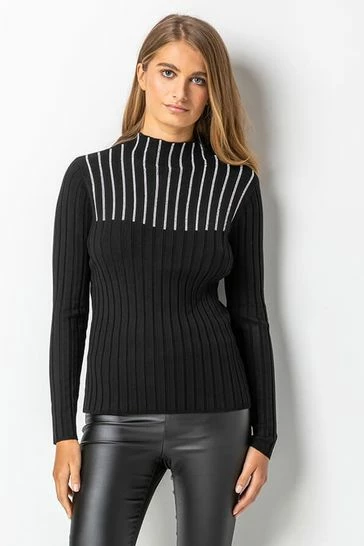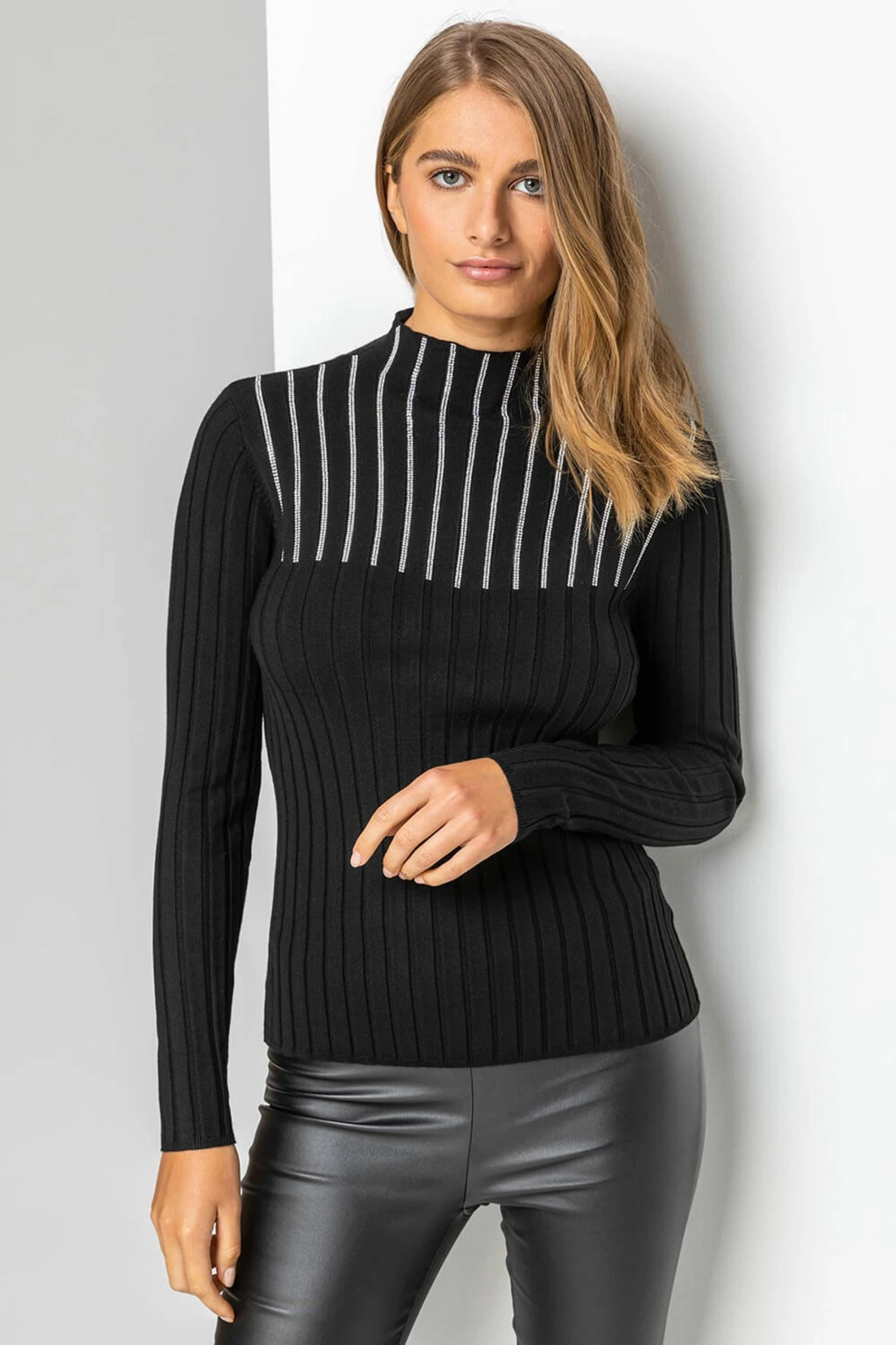 Refresh your knitwear collection with this stunning jewel embellished jumper. Crafted from a beautiful fine rib knit, this luxuriously soft knitted jumper is given a graceful twist with hotfix embellishment and a funnel neckline. Team with formal trousers for a festive feel at work or with a flowing skirt and heels for a cosy but seriously stylish take on evening dressing.