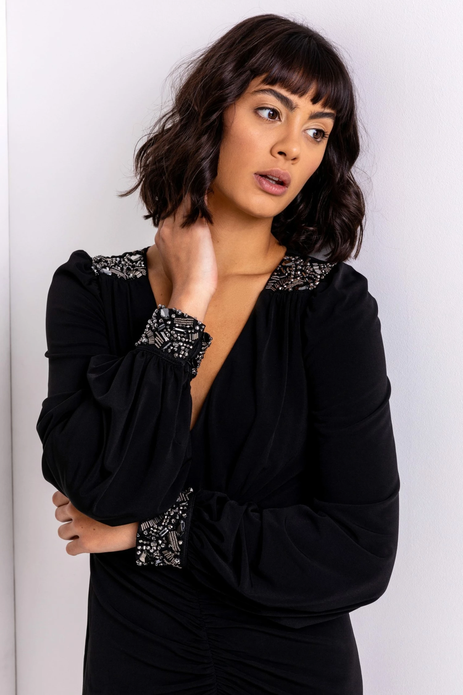 Falling just below the knee with a flawlessly flattering fit, this chic LBD will be a sure head turner this season. This luxe ruched style dress has long sleeves and a plunging v-neckline, delicately finished with a glittering diamante embellished trim on the cuffs and shoulders. Complete the look with some sparkling silver jewellery and clutch bag for the perfect evening ensemble to take you anywhere.