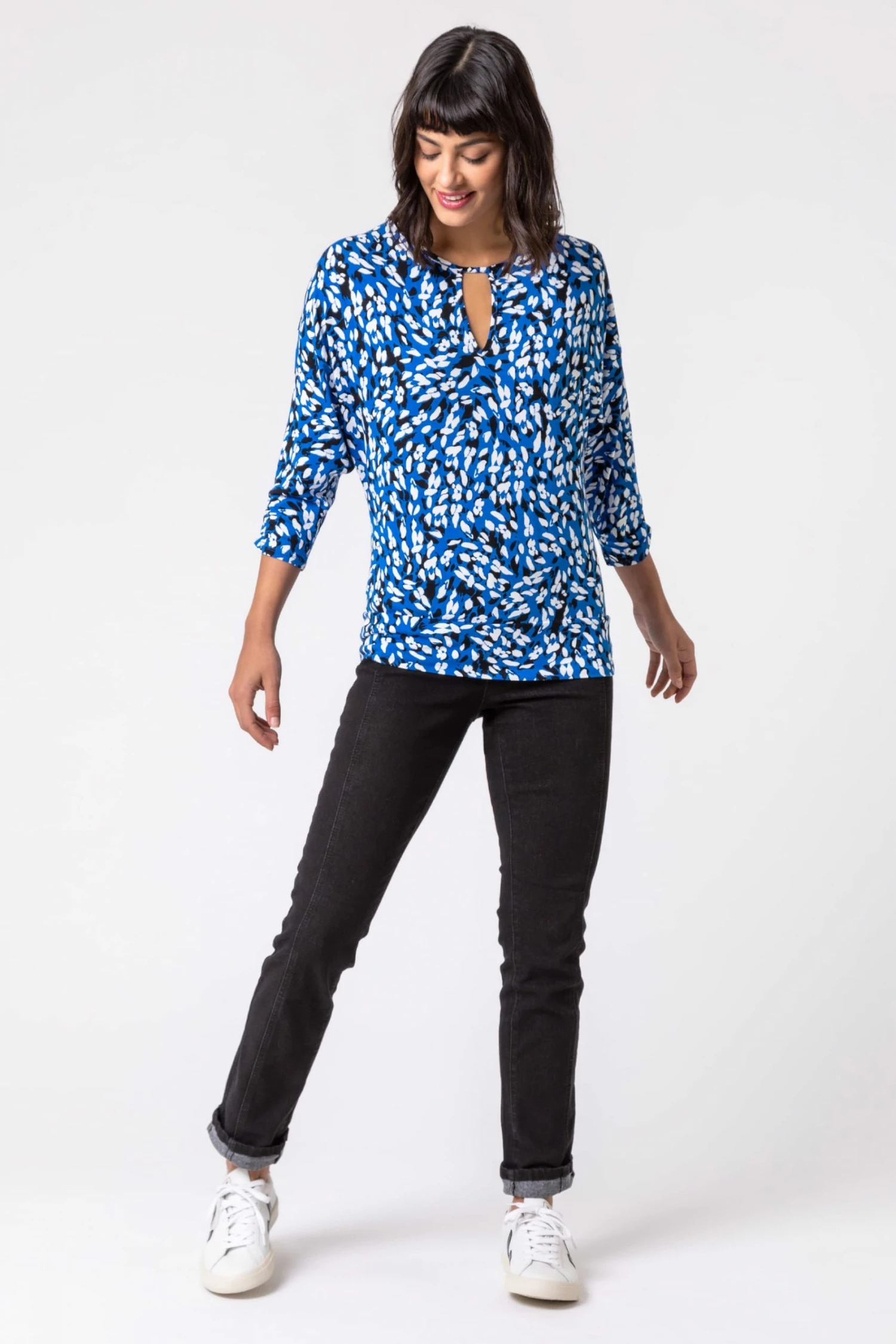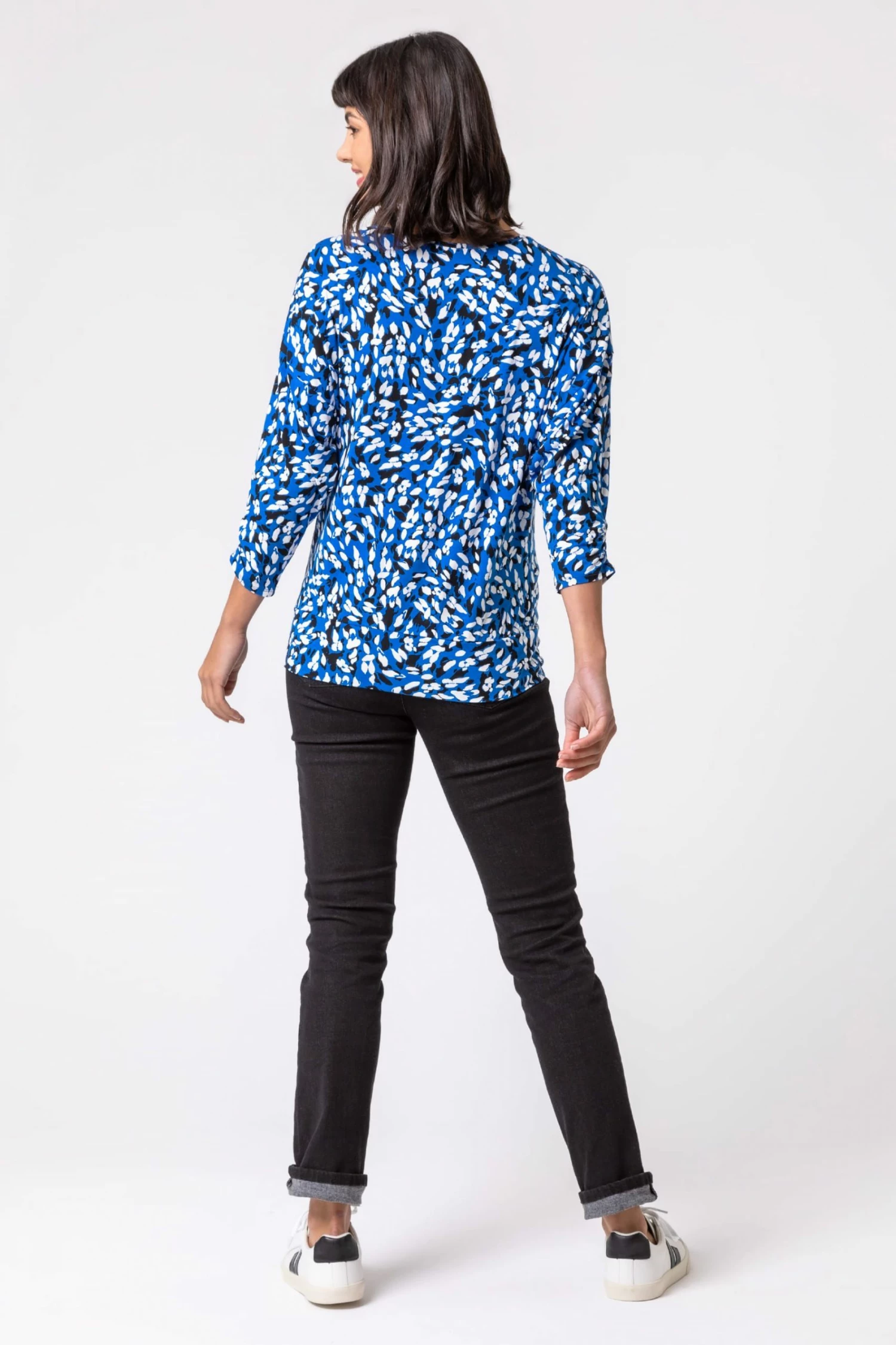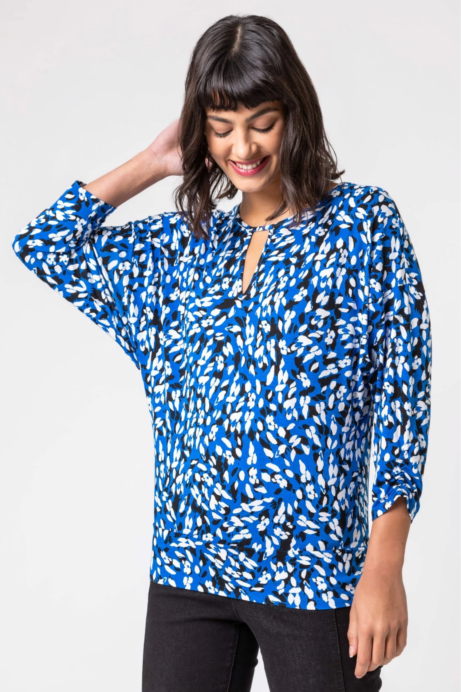 Turn heads when you get back to the office with our smart abstract print blouson top. This ruched 3/4 length sleeve top has a keyhole detail to the rounded neckline. With an elasticated hemline, you ll be comfortable all day long. Pair yours with dark denim and heels for a refreshed spring/summer sophisticated look that ll take you from desk to dinner.