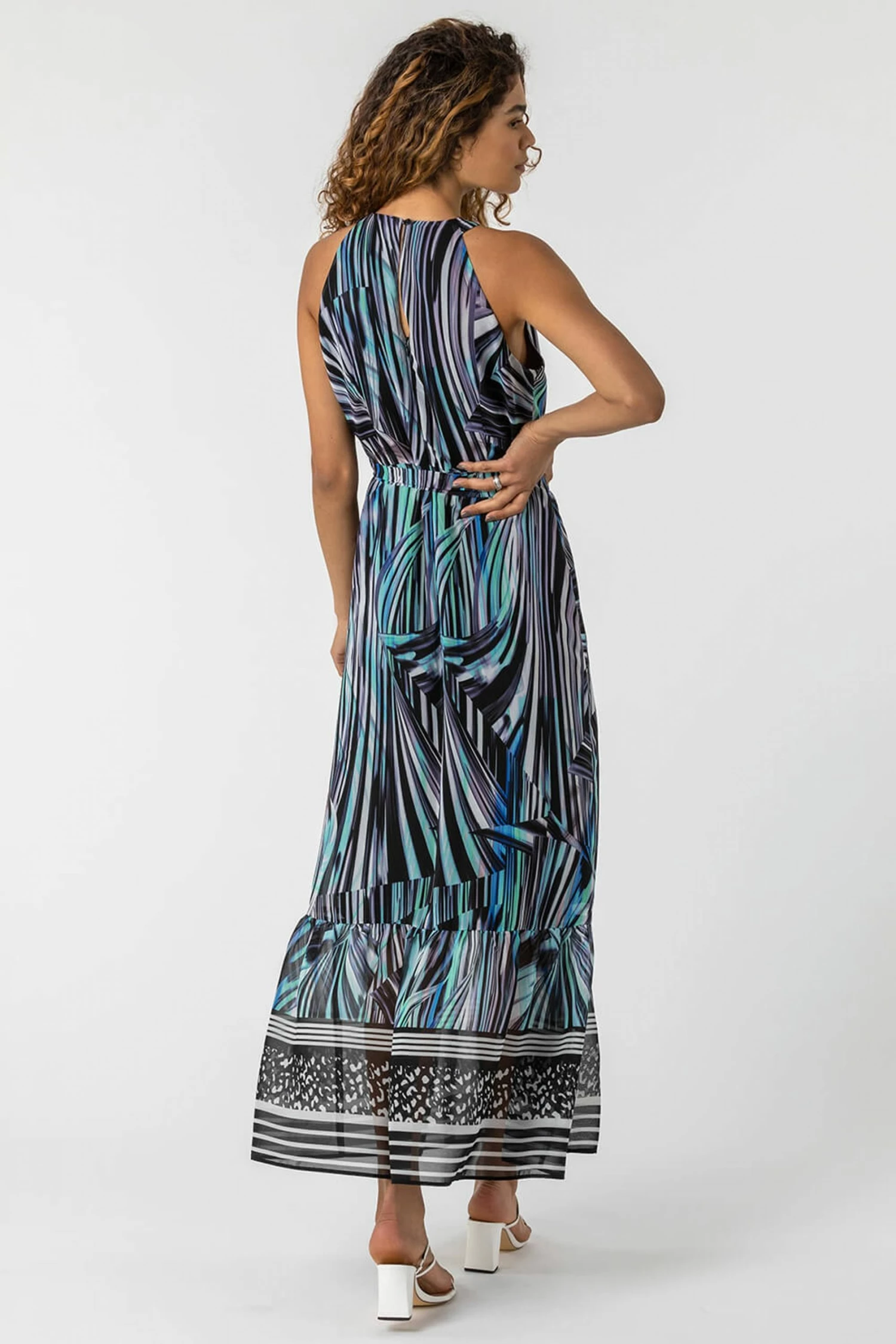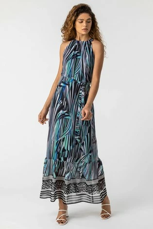 A real showstopper for your next summer holiday, this halter neck maxi dress is bold in shape and style. Finished with an abstract stripe print and contrast border hemline, this floaty chiffon number has a sleeveless silhouette making it perfect for pairing with boleros and shrugs. Our new fave style for summer, this dress has a light lining and fabric tie waist. We can see this looking effortlessly glam at the beachside bar on your next trip abroad or dancing into the evening on a cruise.