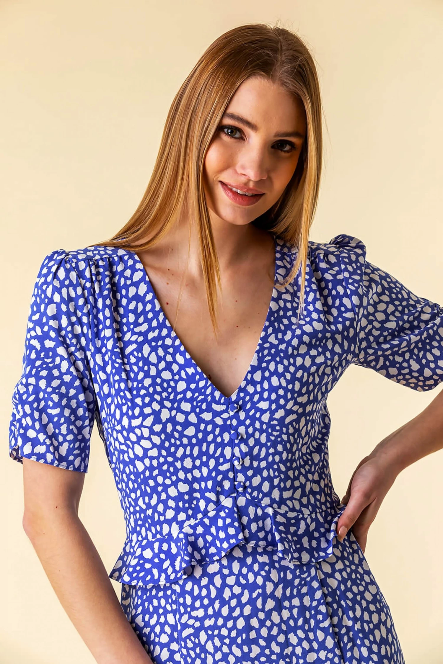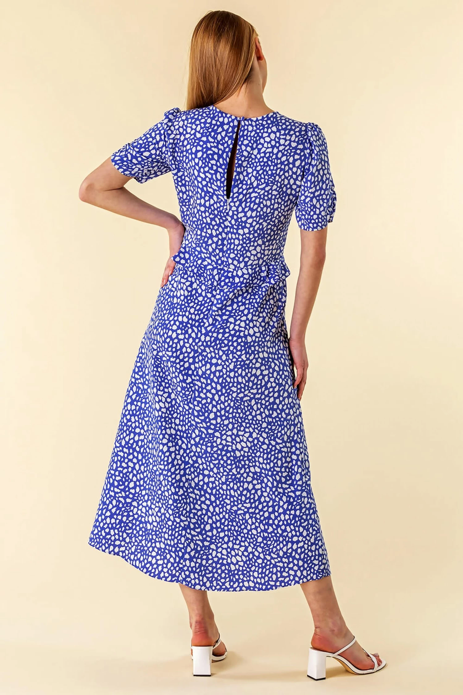 Update your casual collection with this pretty frilly frock! Finished with a flattering v-neckline and ruffled waist, this short sleeve tea dress is ideal for transitioning into spring summer. Adorned in a bright animal print, this midi length dress is timeless in its style. Pair this with pumps for a glamorous picnic in the park outfit!