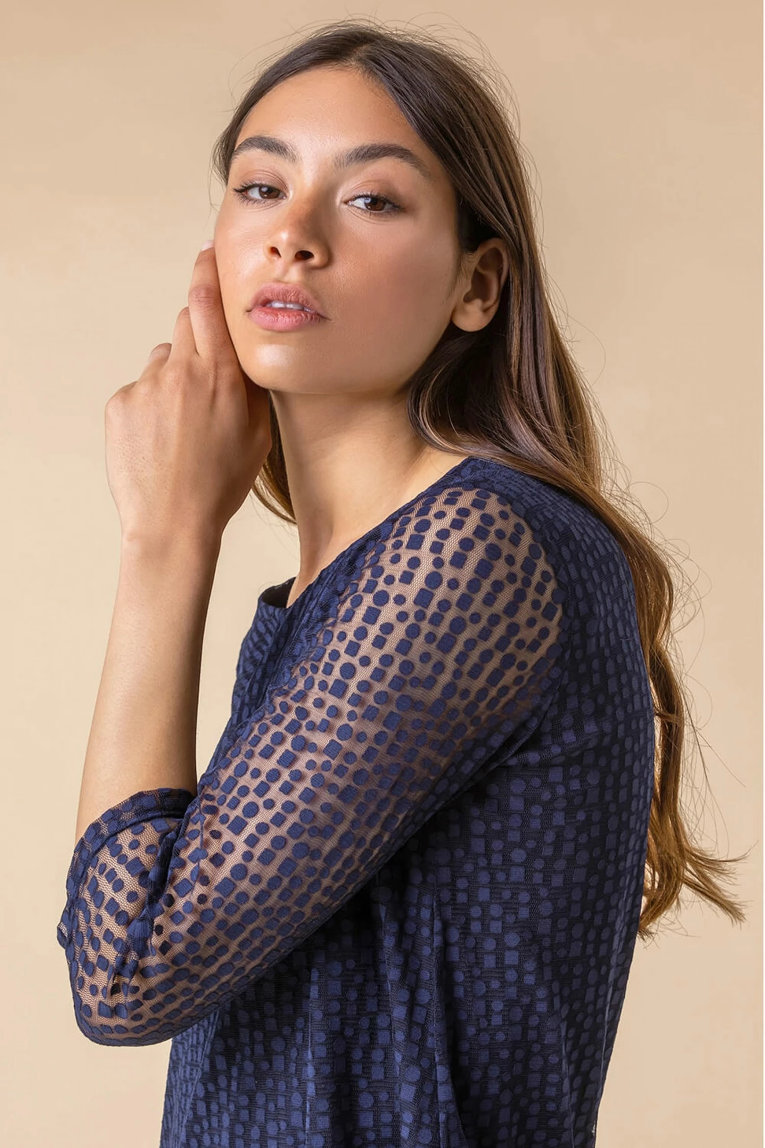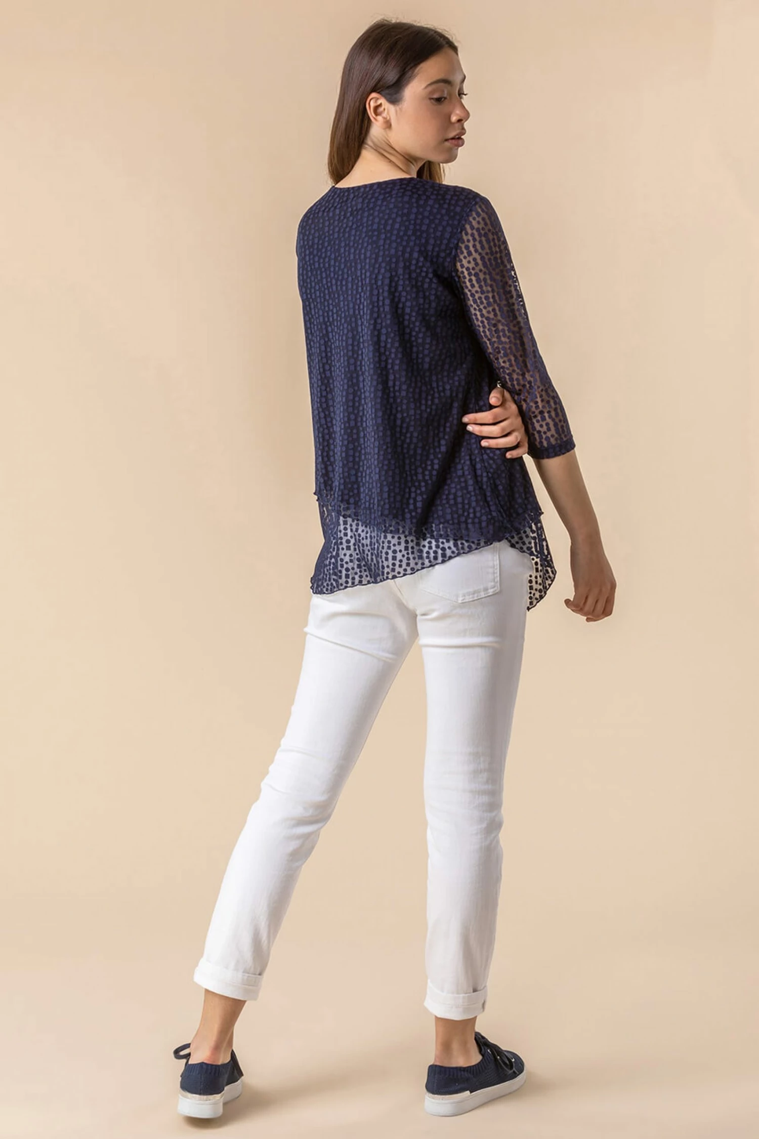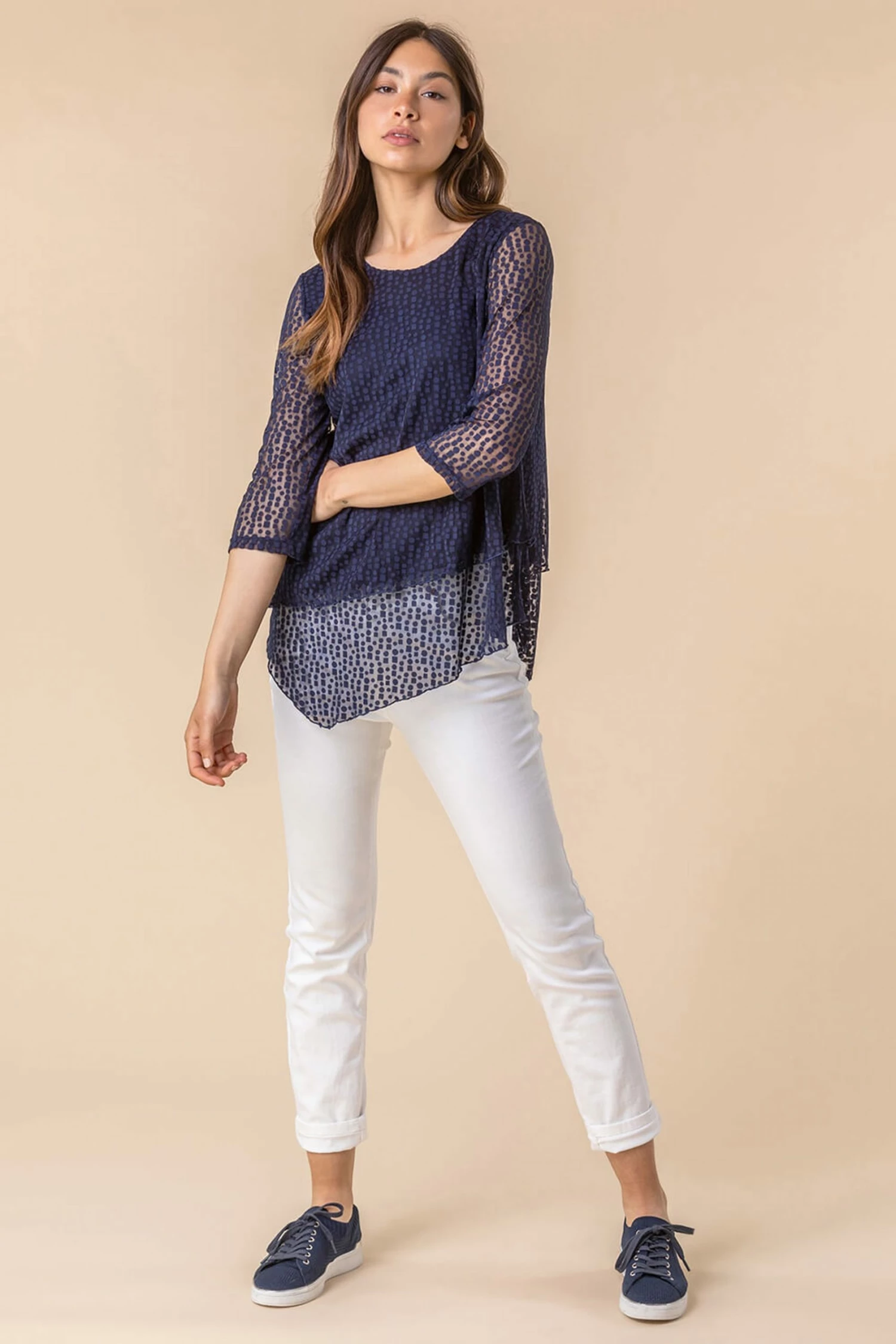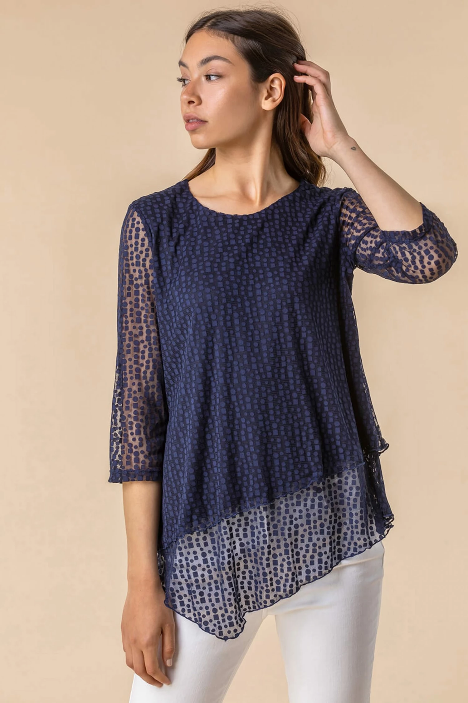 A Feminine Flattering Asymmetric Hem And Beautiful Light Burnout Print Finish This Gorgeous Abstract Print Top. Crafted From Stretch Jersey Material With A Round Neck And Long Sleeves, This Wardrobe Staple Is Endlessly Comfortable. This Style Is Finished With A Floaty Hemline And Trendy Layered Spot Print. Effortlessly Stylish For Those Desk To Dinner Occasions, Dress This Up Or Down To Suit Your Style!.