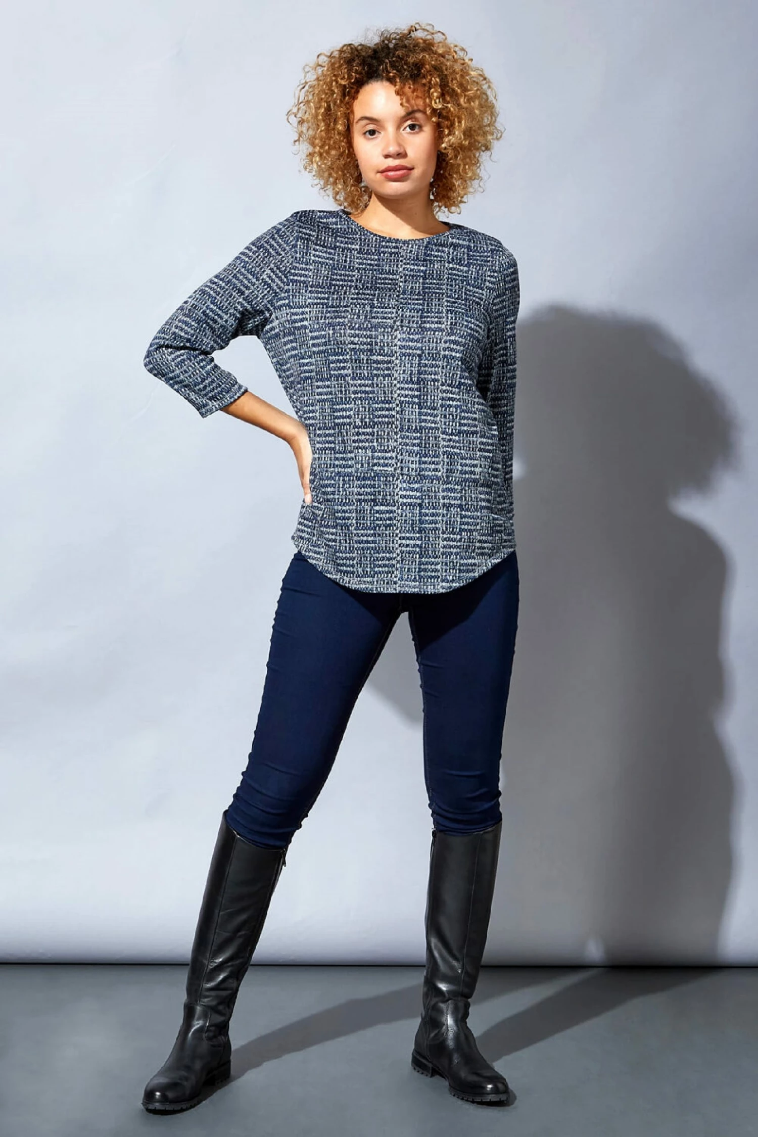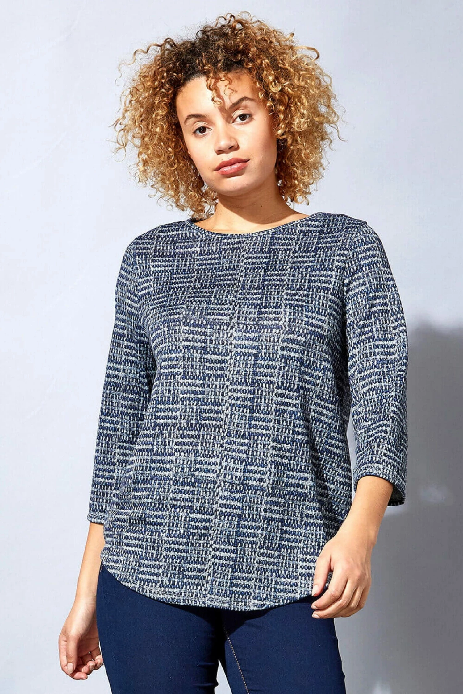 Check all the right boxes with this contrast print jersey top. Sure to become your new wardrobe hero, this pretty tunic top boasts a classic round neckline, 3/4 length sleeves and a contrasting check print in tones of blue and grey. Comfortable and casual, this flattering stretch top is made from a soft and cosy knitted jersey fabric and is ideal for a day at the office or a weekend outing with friends. Pair with jeggings and pumps to complete your look.