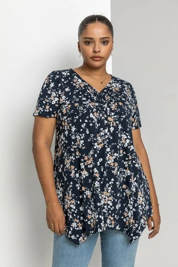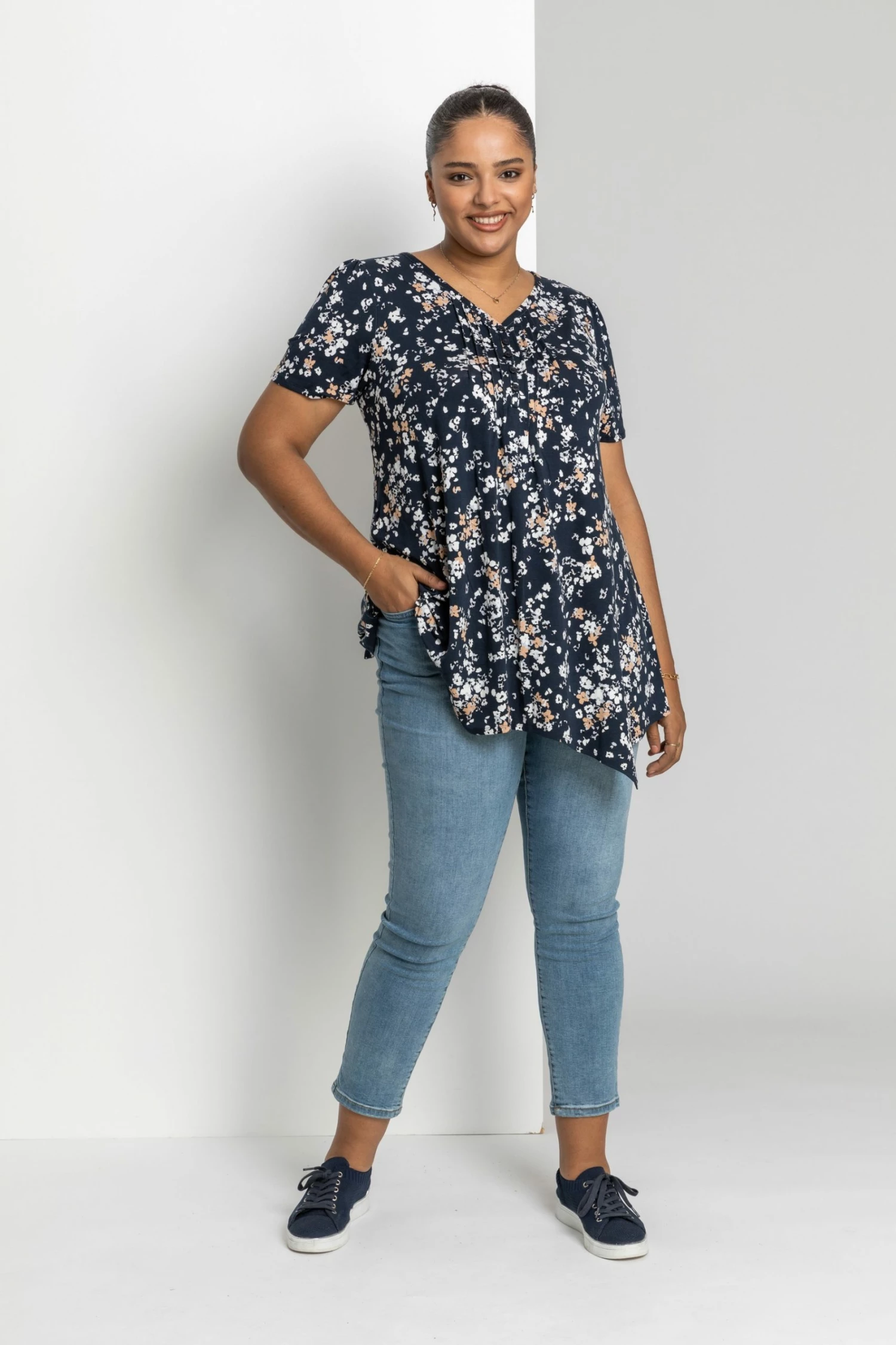 Feminine in Florals! Cut in a hanky hem silhouette, this top will be the perfect addition to your wardrobe! Highly versatile, this style is fashioned with pintuck detailing and flattering v neckline. The short sleeves offer a great opportunity for layering, and the jersey fabric is stretchy and comfortable. Pair yours with your favourite jeggings or leggings, teamed with boots for the colder months.
