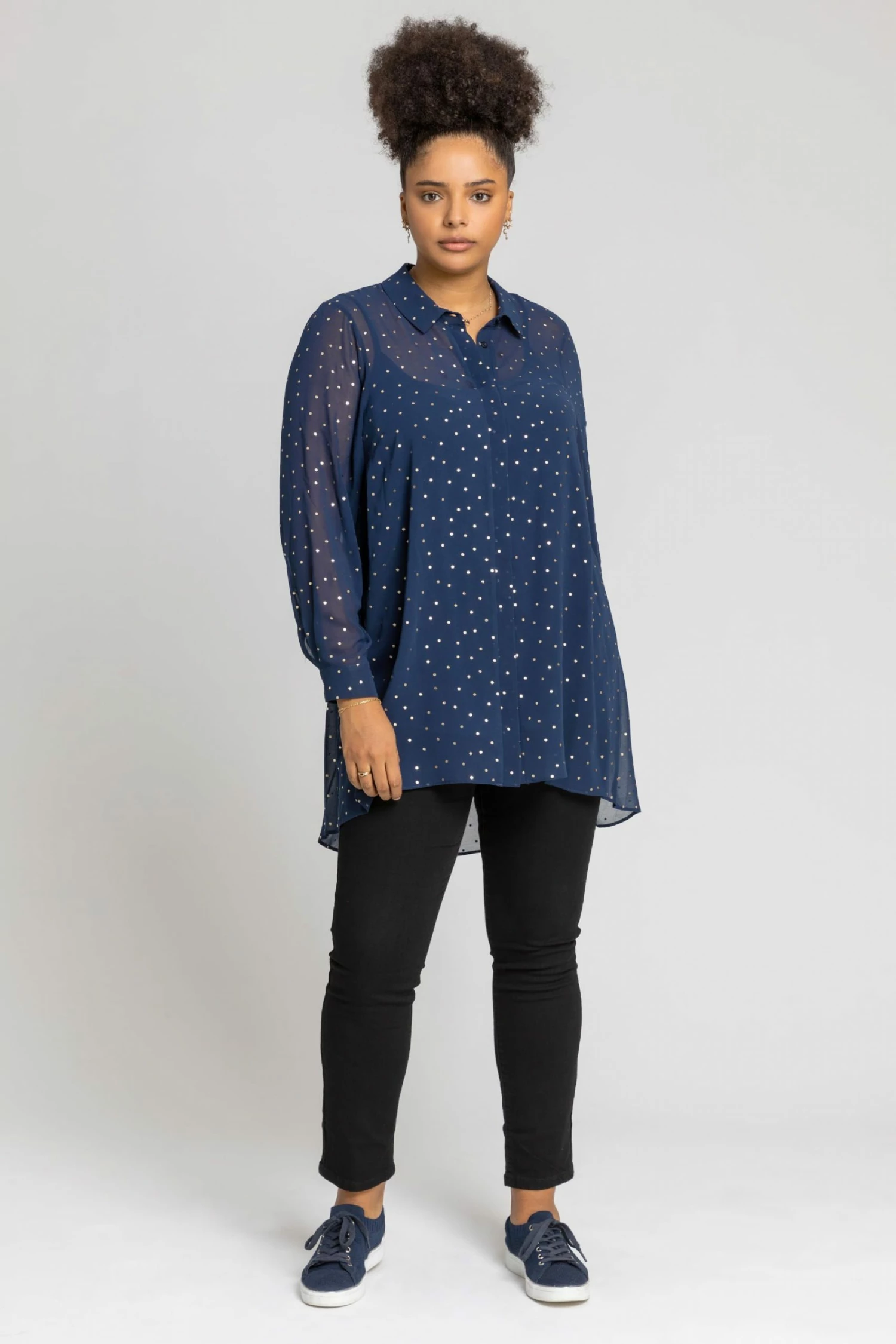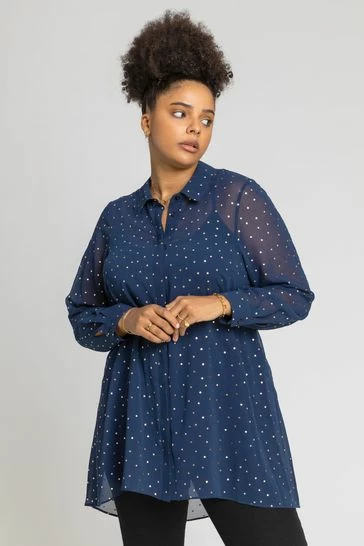 Make an impression with our longline foil spot shirt in our Curve collection. Cut with a relaxed shape, shirt collar and long sleeves, this long blouse is adorned instunning gold polka dots. Complete with an inner cami top, this party number looks great with faux leather trousers.