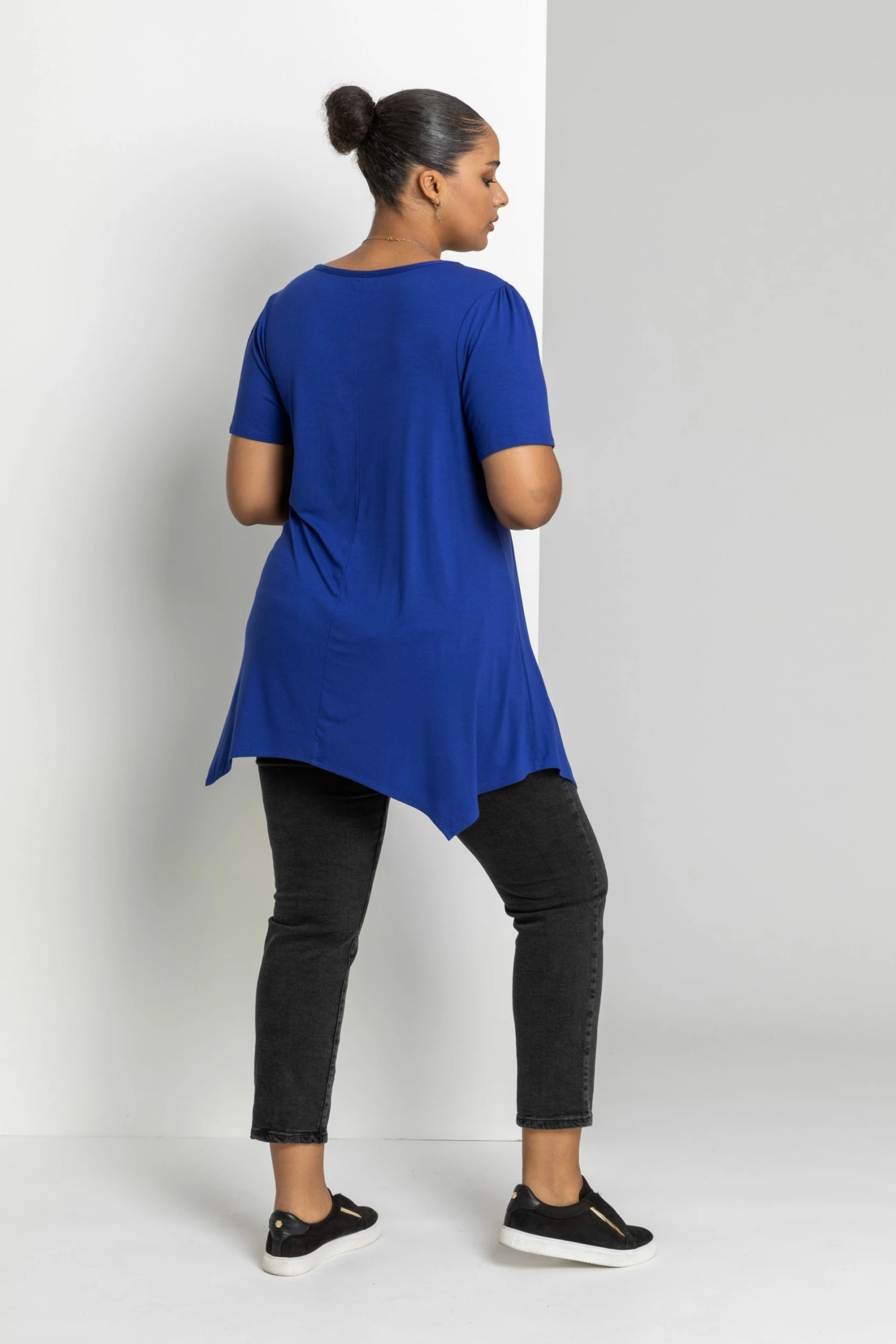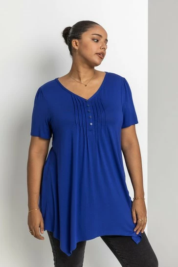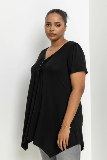 Keep it simple with this Curve casual top; cut in a hanky hem silhouette, this will be the perfect addition to your wardrobe! Highly versatile, this style is fashioned with pintuck detailing and flattering v neckline. The short sleeves offer a great opportunity for layering, and the jersey fabric is stretchy and comfortable. Pair yours with your favourite jeggings or leggings, teamed with boots for the colder months.