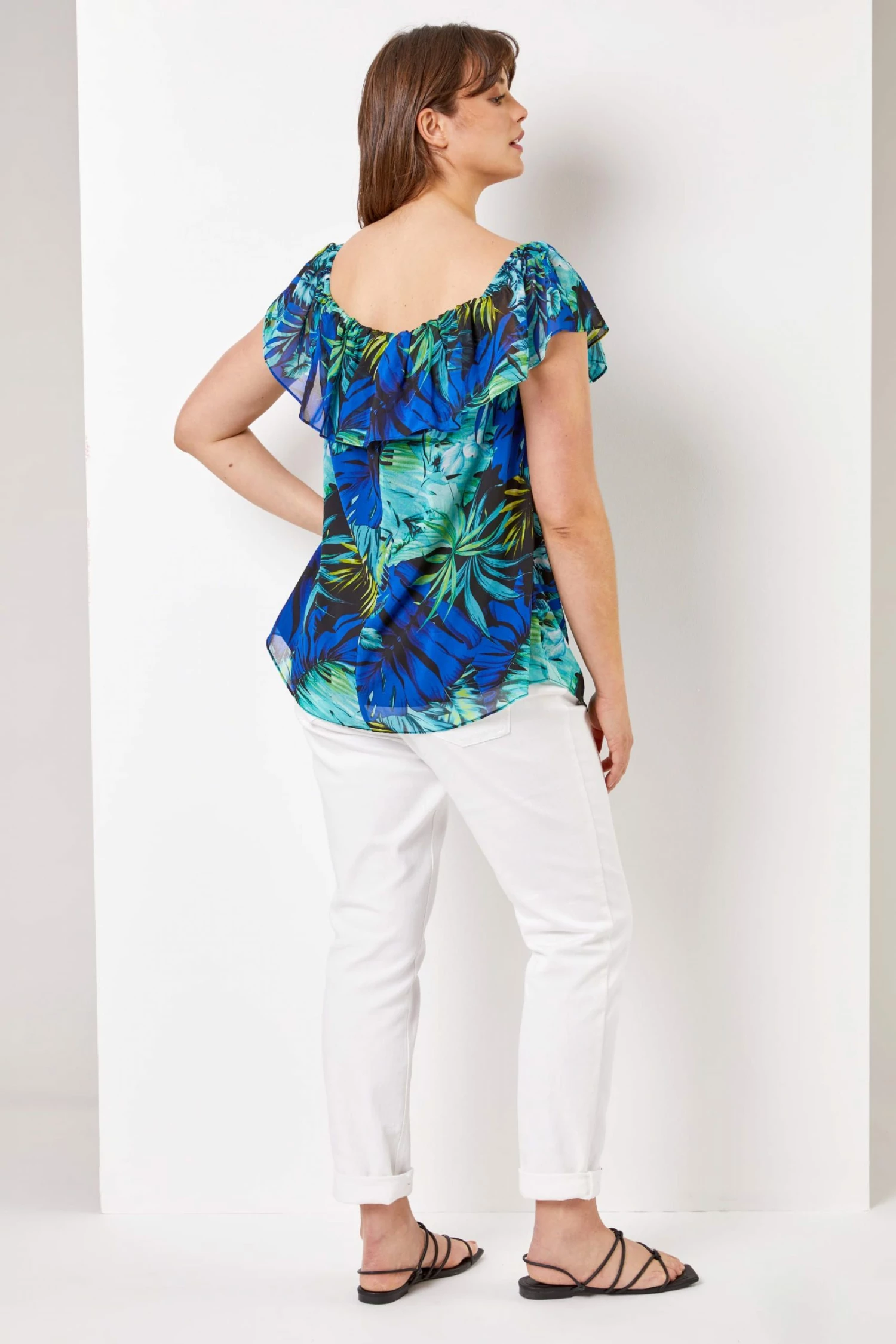 Bringing you tropical vibes this season with our gorgeous Roman Curve tropical print top. Created with a Bardot neckline and chiffon frill detail, this top is so versatile in style. Whether you want to style it as a Bardot or pull the sleeves up, this incredible number is perfect for casual days and night outs alike. Style it with some denim jeans and flats for an on the go look, alternatively wear it Bardot style with trousers, heels and a clutch for an eye-catching look that will turn heads!