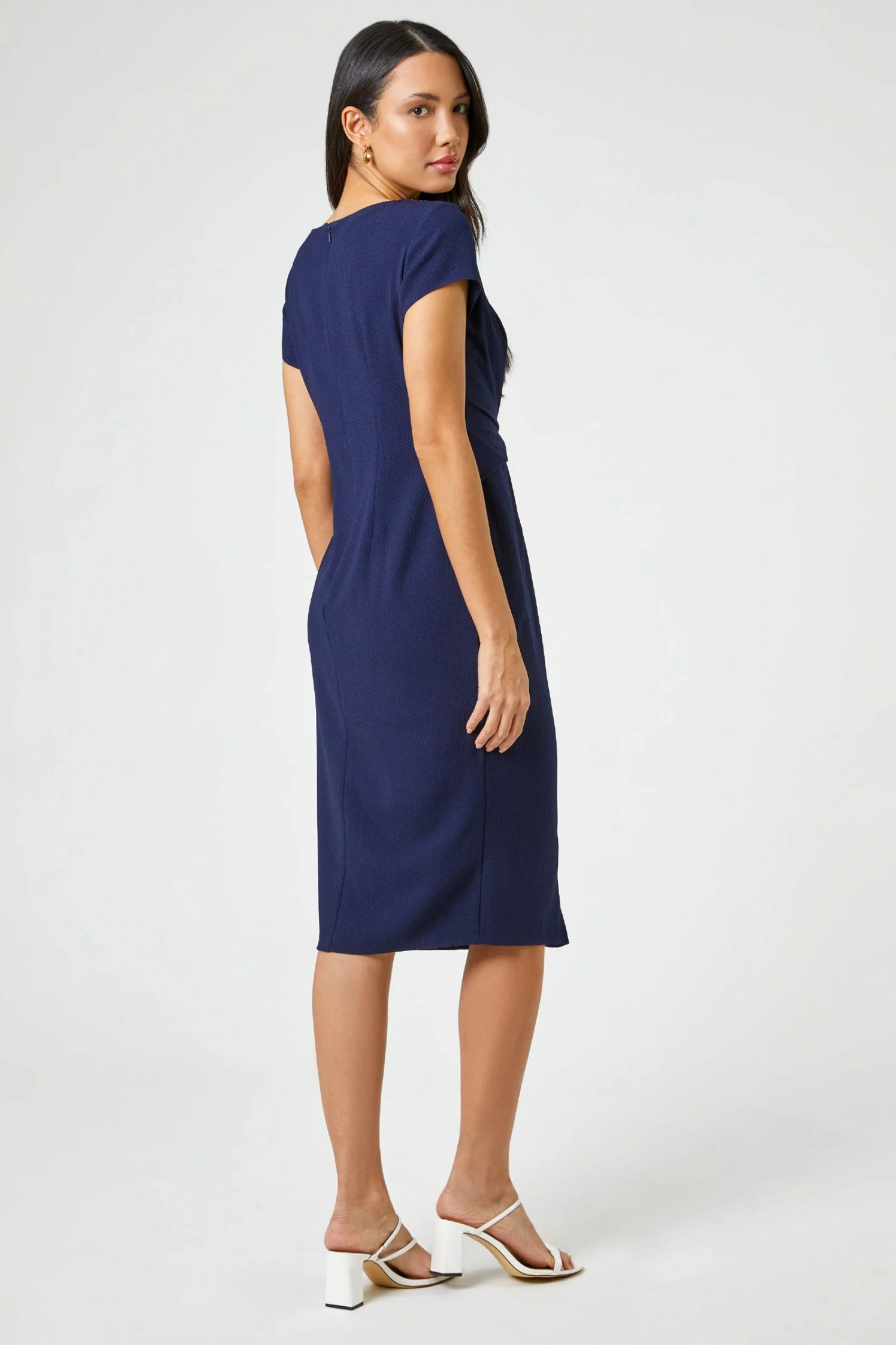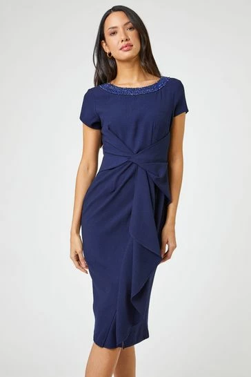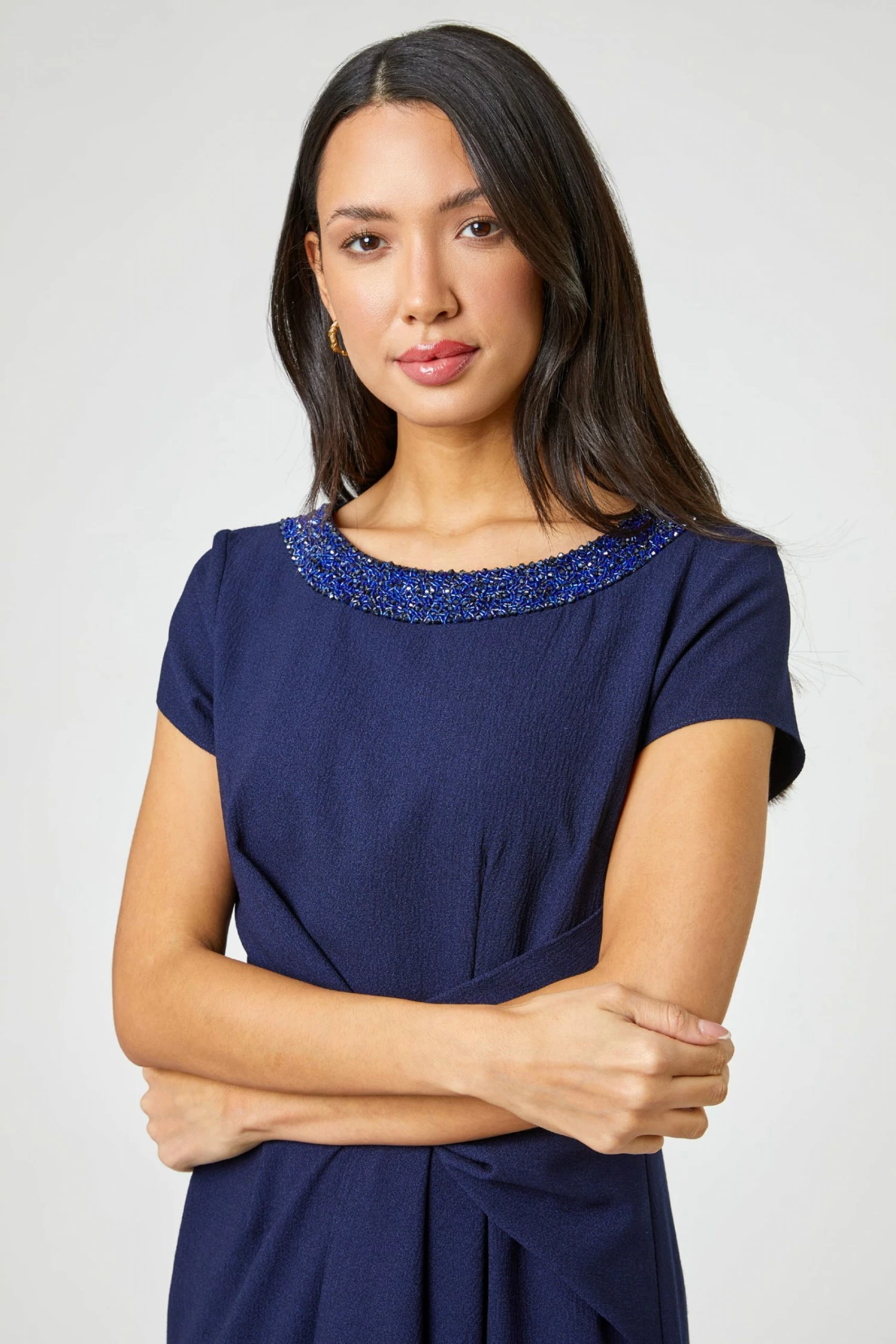 Take your style to the next level with this head-turning embellished dress. Embellished beautifully with delicate beading to the neckline, this short sleeve piece has twist detail to the centre front that falls beautifully down to the hemline finished with a zip fastening. Pair with a glamourous clutch and heels to take elevate your formal outfit.