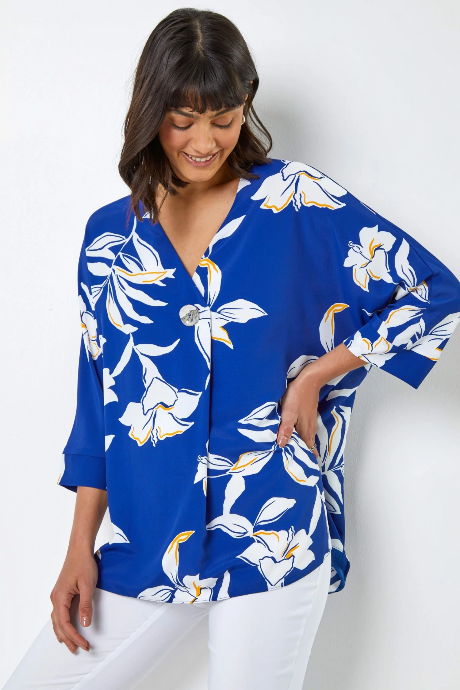 A sure-fire way to inject some print into your looks, this tunic top is sure to turn heads with its bold floral print. Featuring 3/4 length sleeves, a flattering v-neck and a statement shiny button, this top is halfway between smart and casual. Dress it up or down to suit your occasion. This timeless printed top can be paired with cropped trousers to really make a statement, or toned down with a blazer and trousers for work.