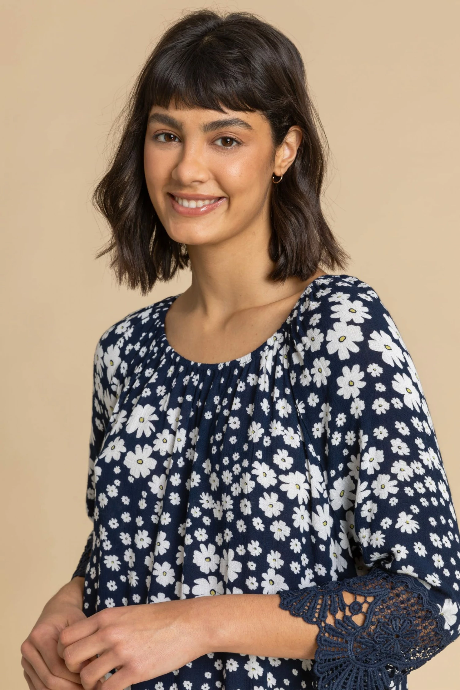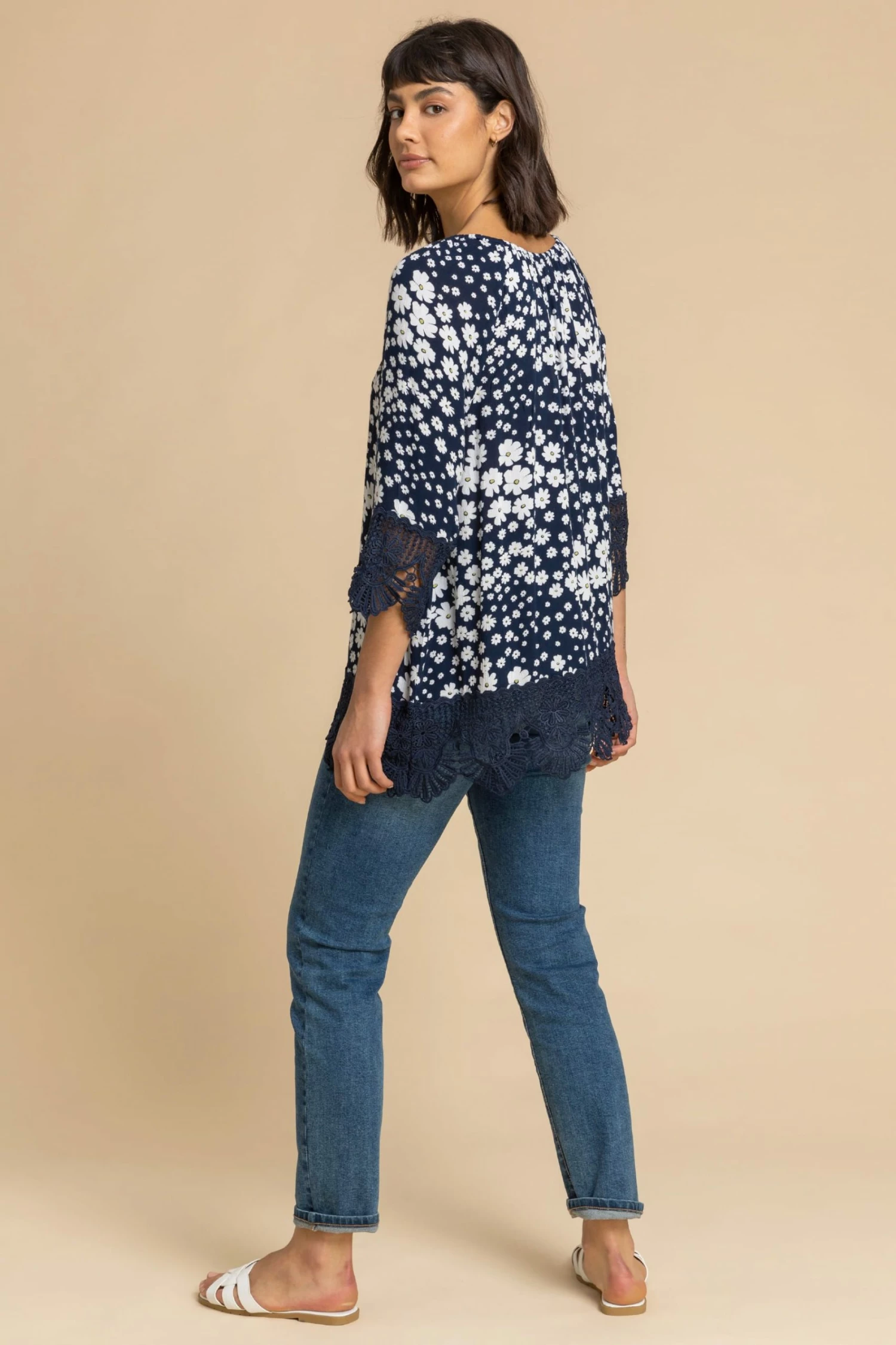 Bloom into the season in this daisy printed floral top. Have an afternoon brunch with the girls and throw on this stunning top to get yourself in the season s trends. Magnifying the hemline and the ¾ sleeves with a feminine lace trim, this top is a must have piece for Spring. Pair with a straight leg jean and trainers for a dressed up casual style.