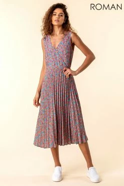 Crafted from a ditsy floral material and with a glamorous fit and flare shape, our brand new pleated midi dress is so stunning. With a plunging v-neckline and sleeveless shape, this floaty a-line number has pleats all down the skirt that creates a beautiful silhouette. Perfectly pair this piece with a knitted shrug for your next garden party or summer holiday at home or abroad!