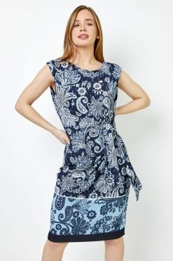 Our figure skimming evening dress is a real showstopper! The Petite silhouette falls just below the knee and is sure to add a pop of colour to your occasion looks. This style has a flattering boat neckline, tie side detail and cap sleeve to give your look a sophisticated edge whilst the floral paisley border print is striking for the Summer. Add a cropped jacket and heels for a special occasion or add a blazer for the workplace.