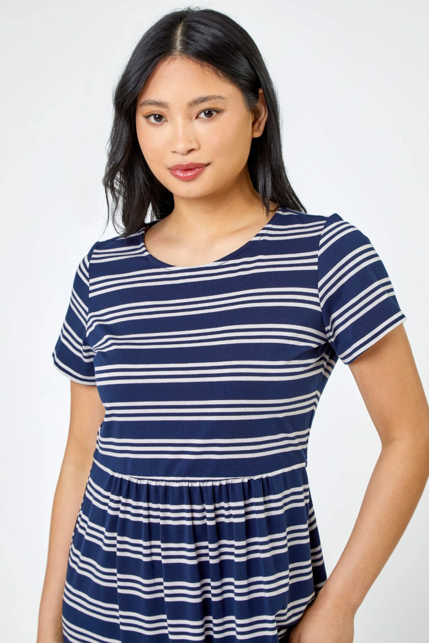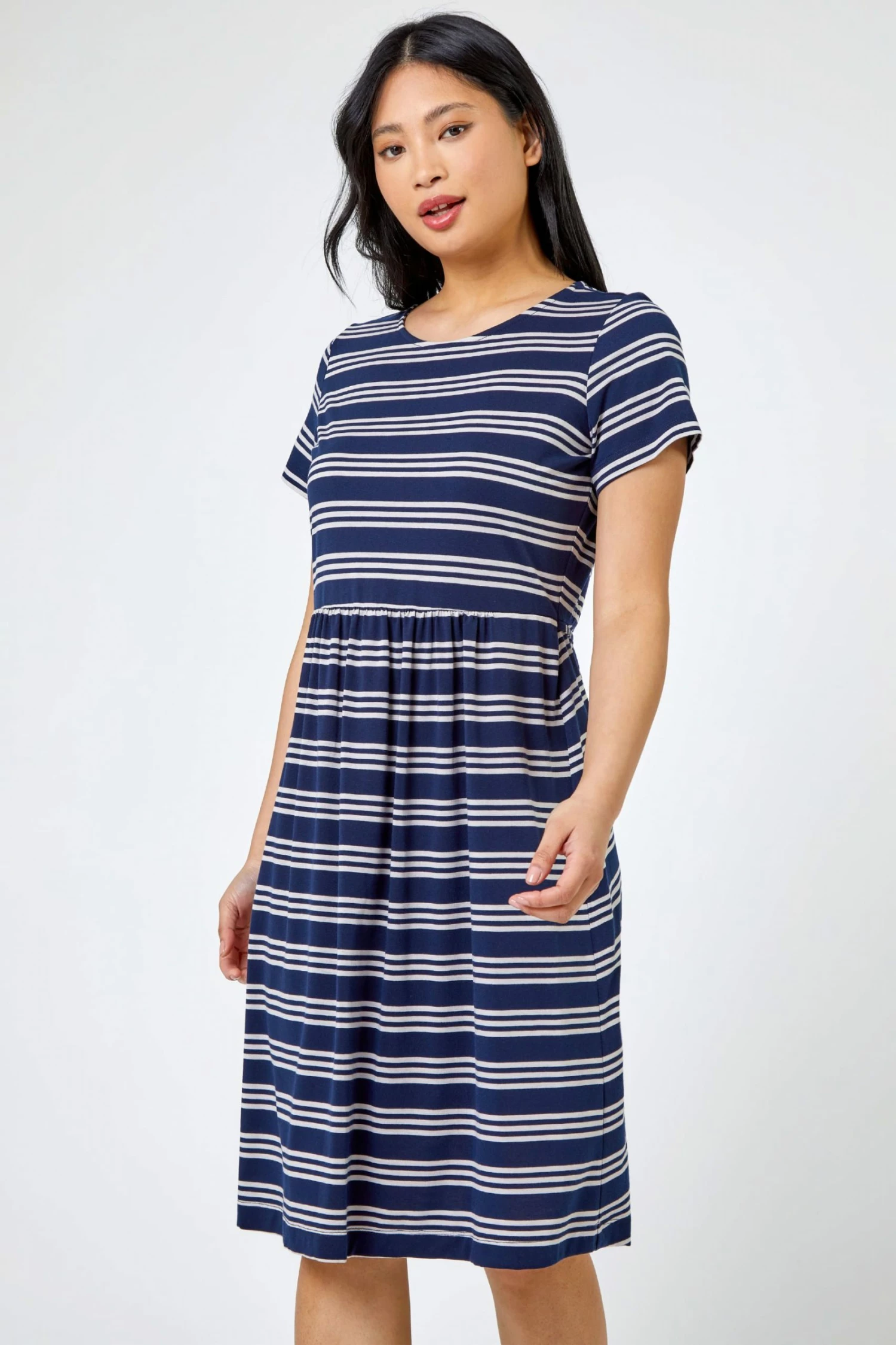 Classic stripes and skater styles combine in this gorgeous t-shirt dress. Keep it casual with the help of the round neck, short sleeve and gathered skirt silhouette, an easy pull on shape with lots of stretch. This stripe printed dress has a real soft jersey finish that is so kind to the skin, great for running errands and feeling stylish at the same time. Complete the everyday look with your go-to pumps and denim jacket, effortlessly cool and endlessly comfortable!