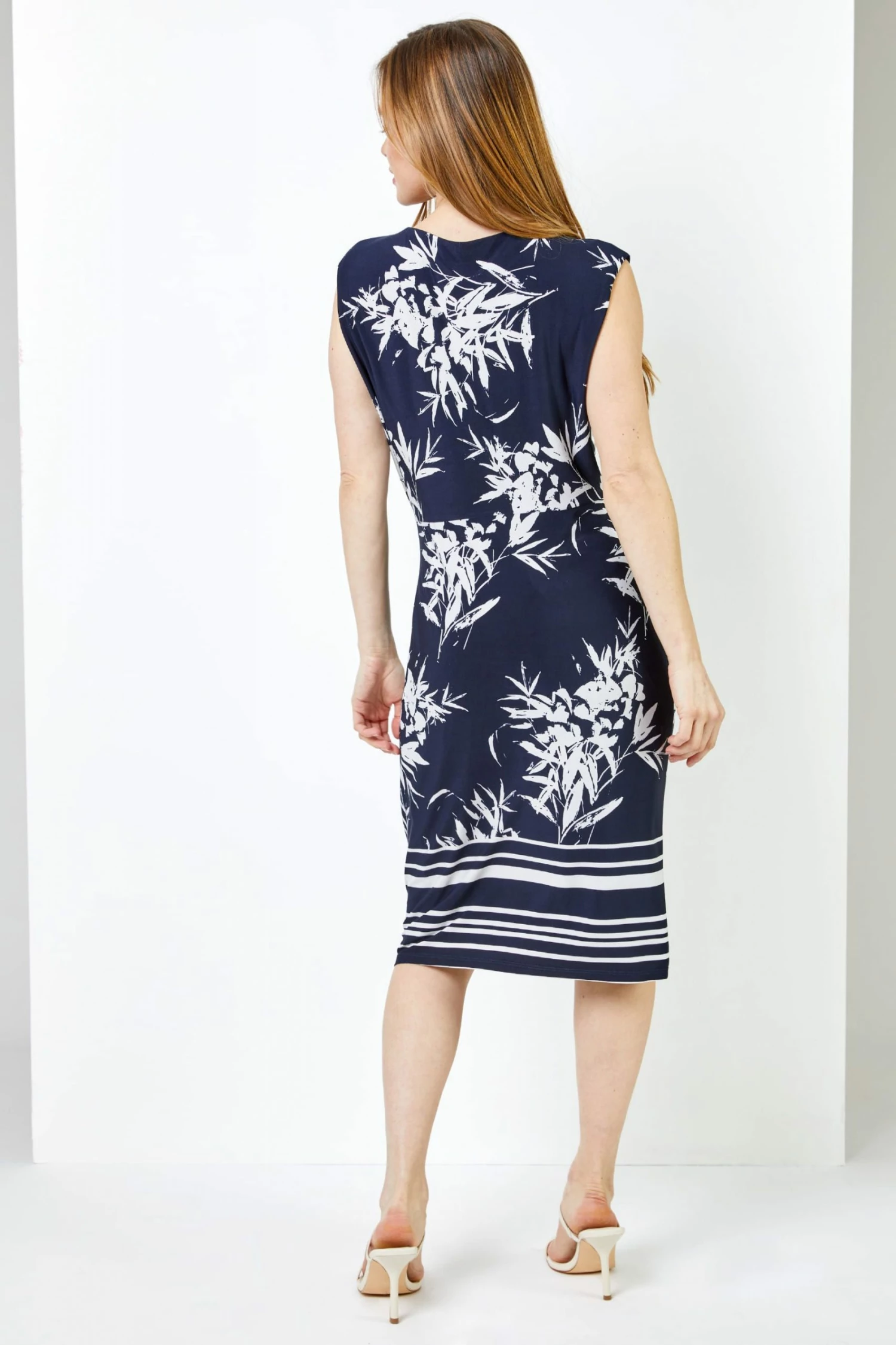 Our figure skimming evening dress is a real showstopper! The Petite silhouette falls just below the knee and is sure to add a pop of colour to your occasion looks. This style has a flattering boat neckline, tie side detail and cap sleeve to give your look a sophisticated edge whilst the bamboo border print is striking for the Summer. Add a cropped jacket and heels for a special occasion or add a blazer for the workplace.