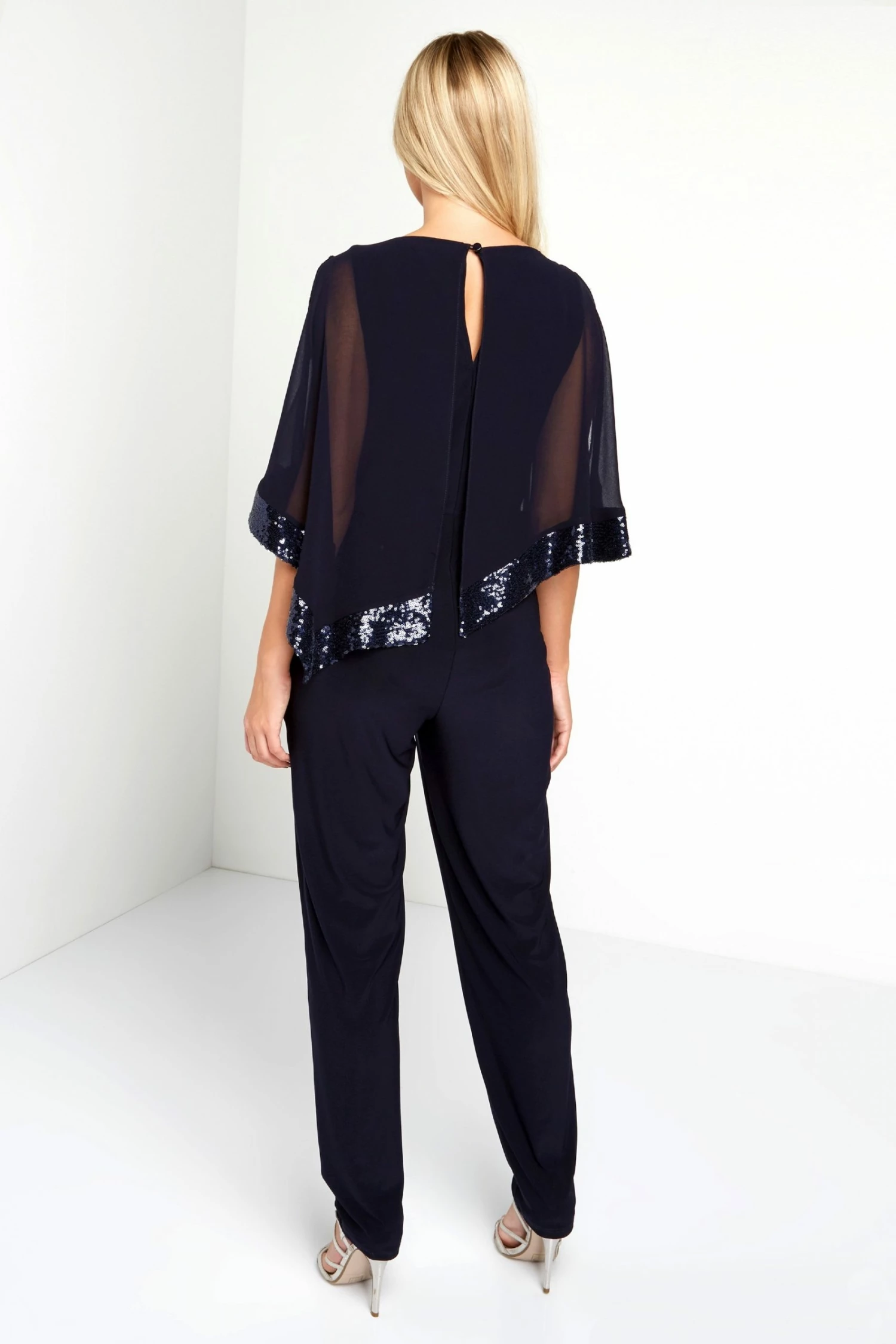 Update your wardrobe with this gorgeous jumpsuit. Featuring an elegant chiffon and sequin layer and a classy straight leg, perfect for going out with the girls. Team with high heels and clutch bag.