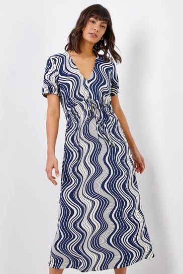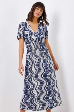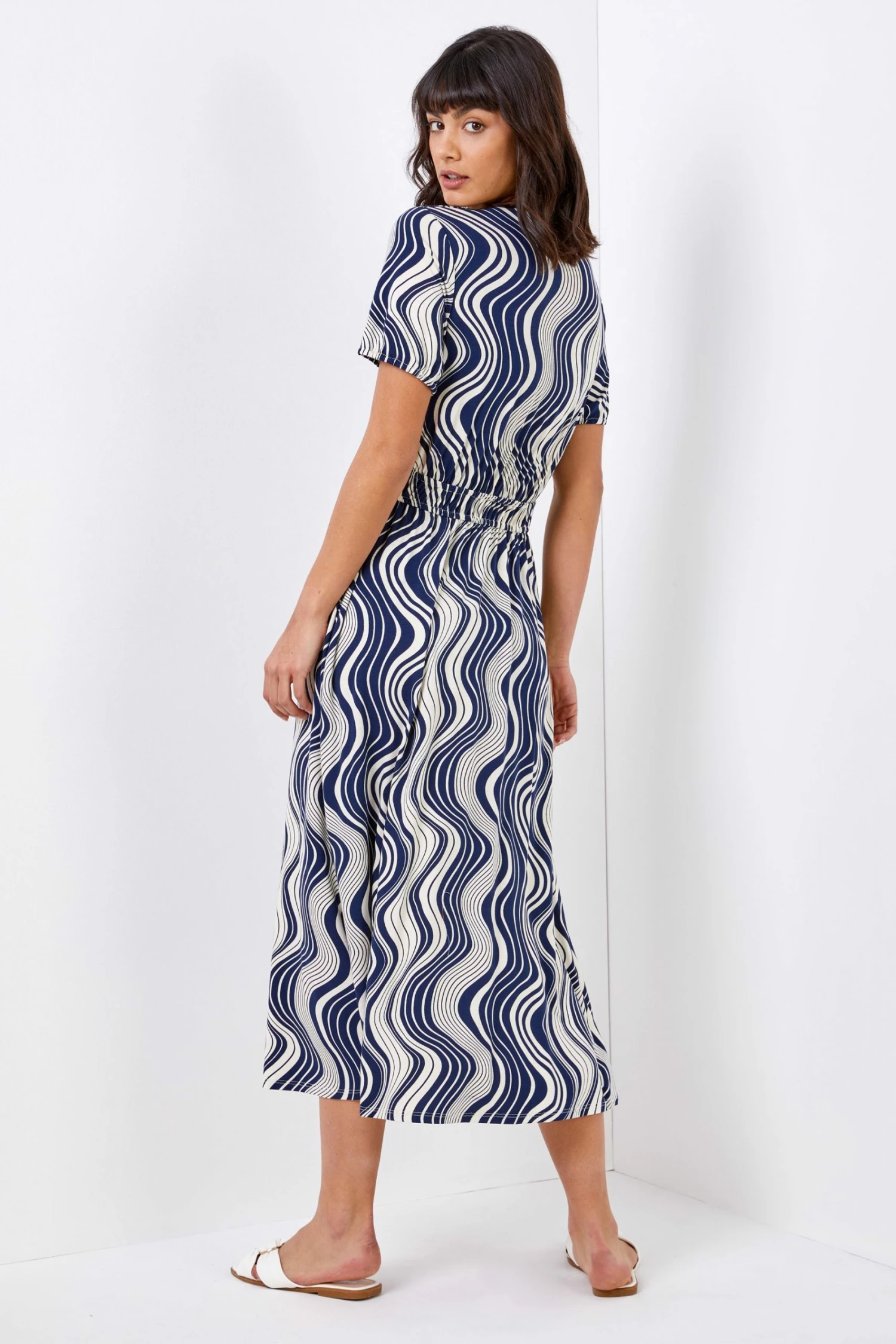 Get wavey with this seasons favourite swirl print fit and flare piece. Cut in a stretch jersey material to a demure midi length, this v-neck dress has short elasticated sleeves and finished with a tie fastening to the stretch waistband. Add this summer holiday addition to your wardrobe and pair with your favourite sandals and a tote bag to complete your look.