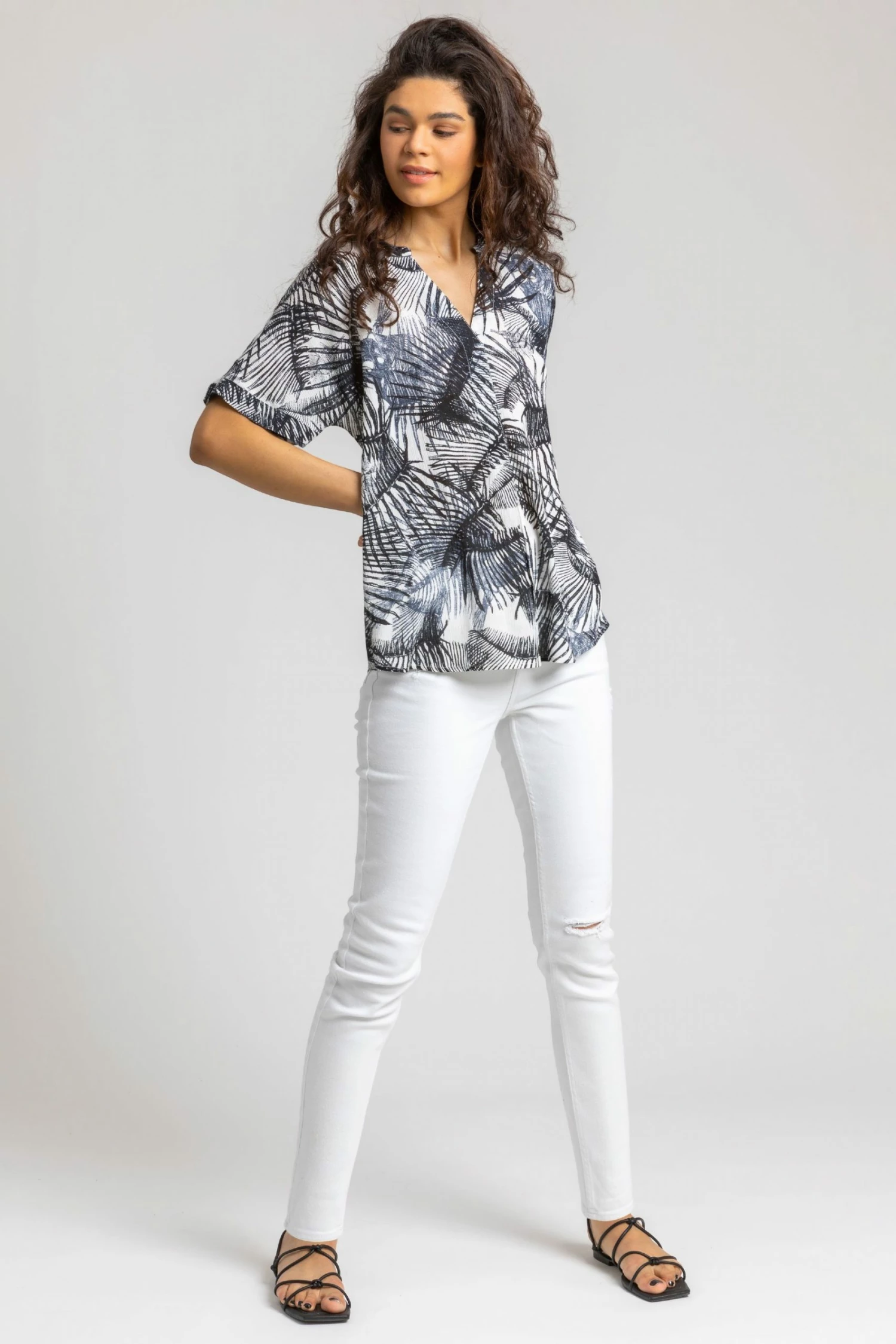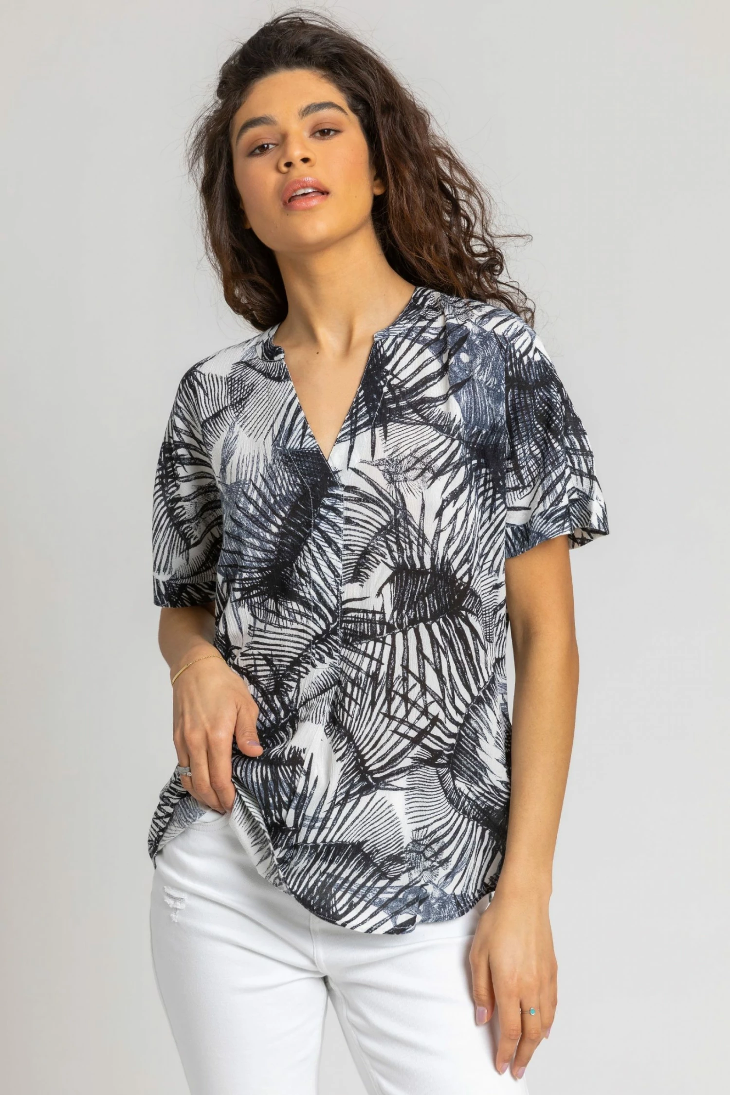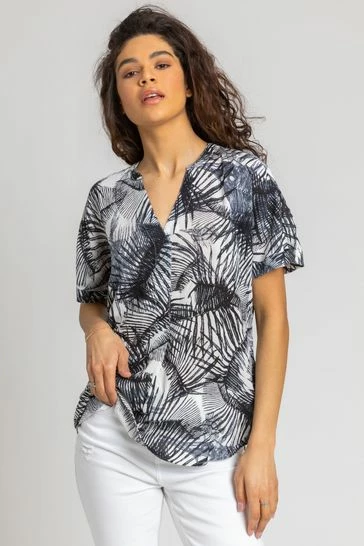 Take us to the tropics! Adorned in a beautiful monochrome palm leaf print, this tropical-inspired number features a classic v-neckline and short sleeves. Perfect for your holiday, make sure to pack this piece in your suitcase this year. Pair with Roman must-have cropped trousers and sandals for a beach babe style.