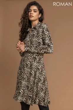 Take a walk on the wild side with this leopard print shirt dress! This jersey day dress has a flattering fit and flare shape, shirt collar detail, a button through fastening and long sleeves. Pair this with black tights for the colder months, and add a pair of heels for an evening out!