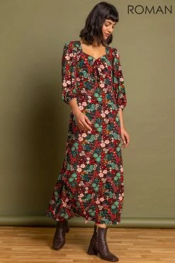 Flatter your figure in feminine prints this season with our floral midi length dress. Featuring elegant long sleeves with elasticated cuffs, this daywear piece is finished with beautiful gathered detail to the bust creating a sweetheart neckline. Pair with everyday pumps for a casual day look or dress up with heels and statement jewellery for an occasion-ready outfit.