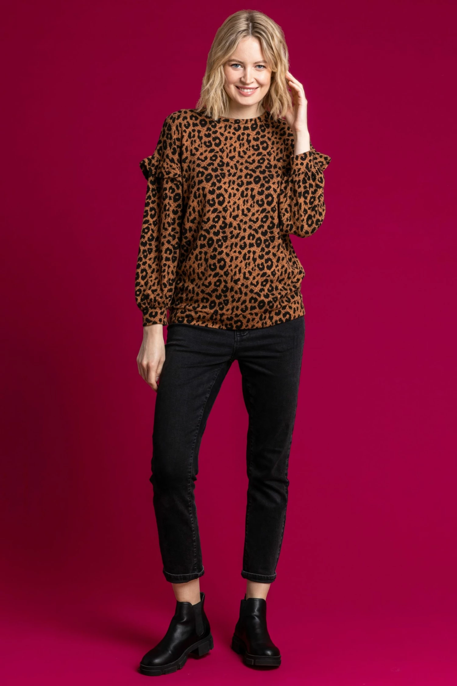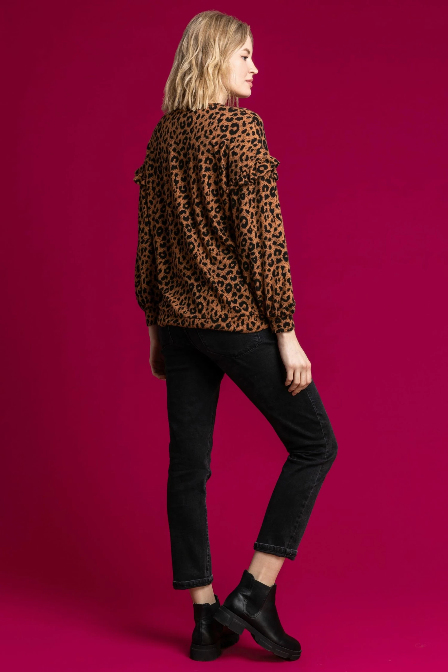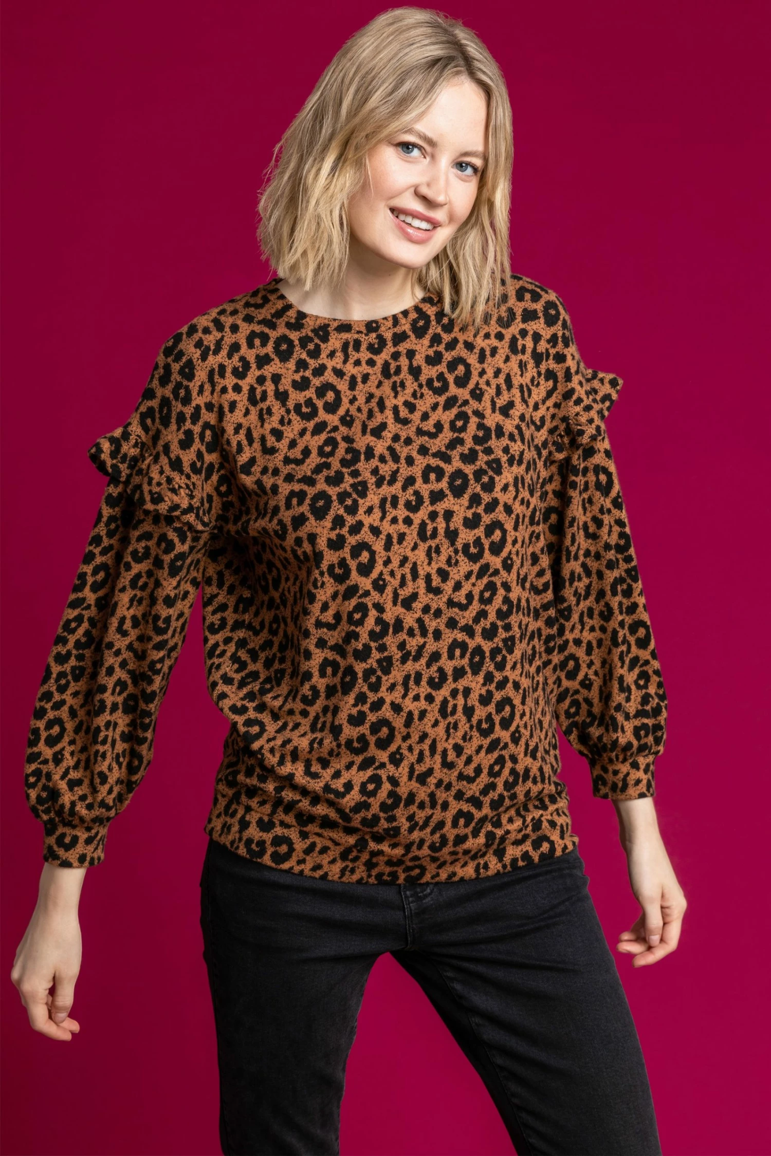 Let this wild style prowl into your casual wardrobe this season with its feminine frill detail and comfy silhouette. Crafted from a soft jersey material, this full sleeve sweater is a real casual fave. Style with your fave leggings or jeans and trainers for the ideal off-duty outfit.