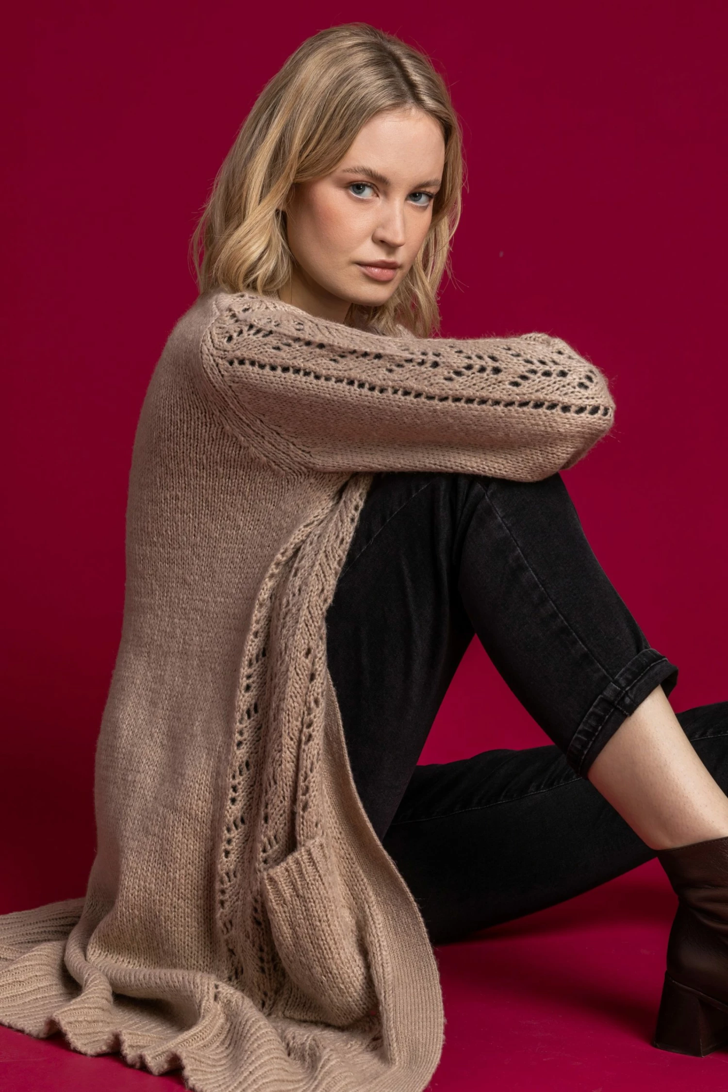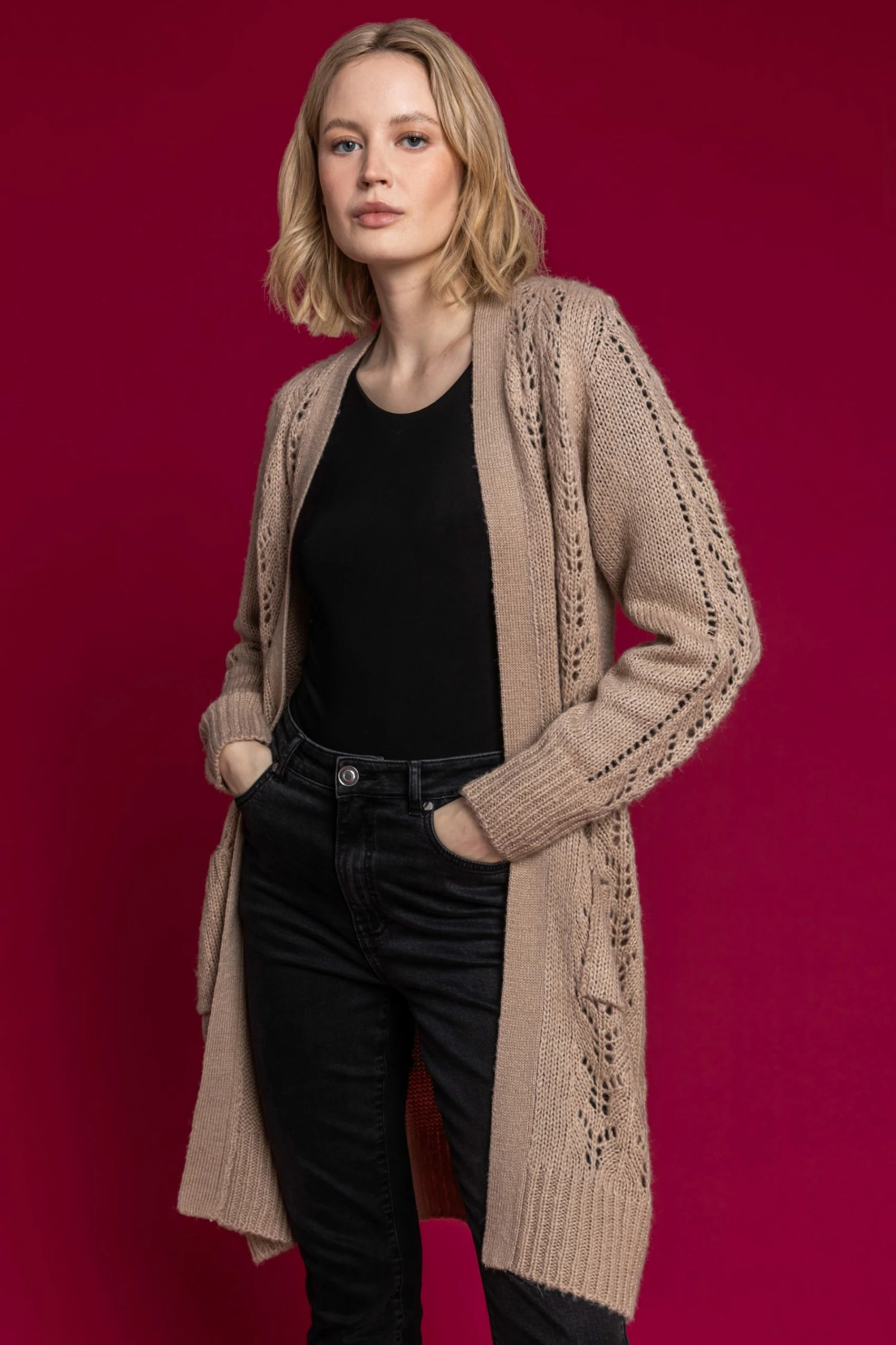 The perfect throw on and go piece, our pointelle longline cardigan is a wardrobe saviour. Finished with stitch detailing and knitted in a relaxed casual fit, this long cardi features front pockets for functional use. Layer over a t-shirt and jeans for a chic casual look.