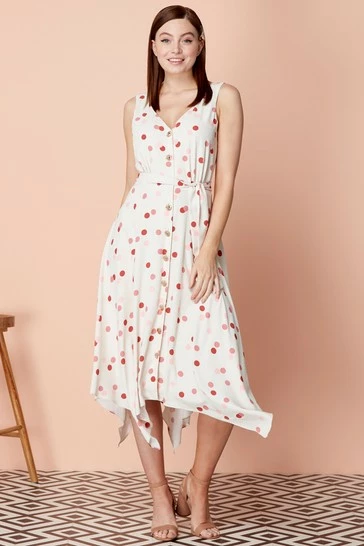 A go to, easy to wear dress that can be dressed up for those romantic date nights or worn casually with sandals or trainers during the day. This versatile fit and flare shape has button fastening down the front of the dress with a belt to accentuate your waist. The polka dot print will have you looking spot on whether you’re attending a garden party or simply need a new outfit for a special holiday, this dress will be the perfect addition to your wardrobe.