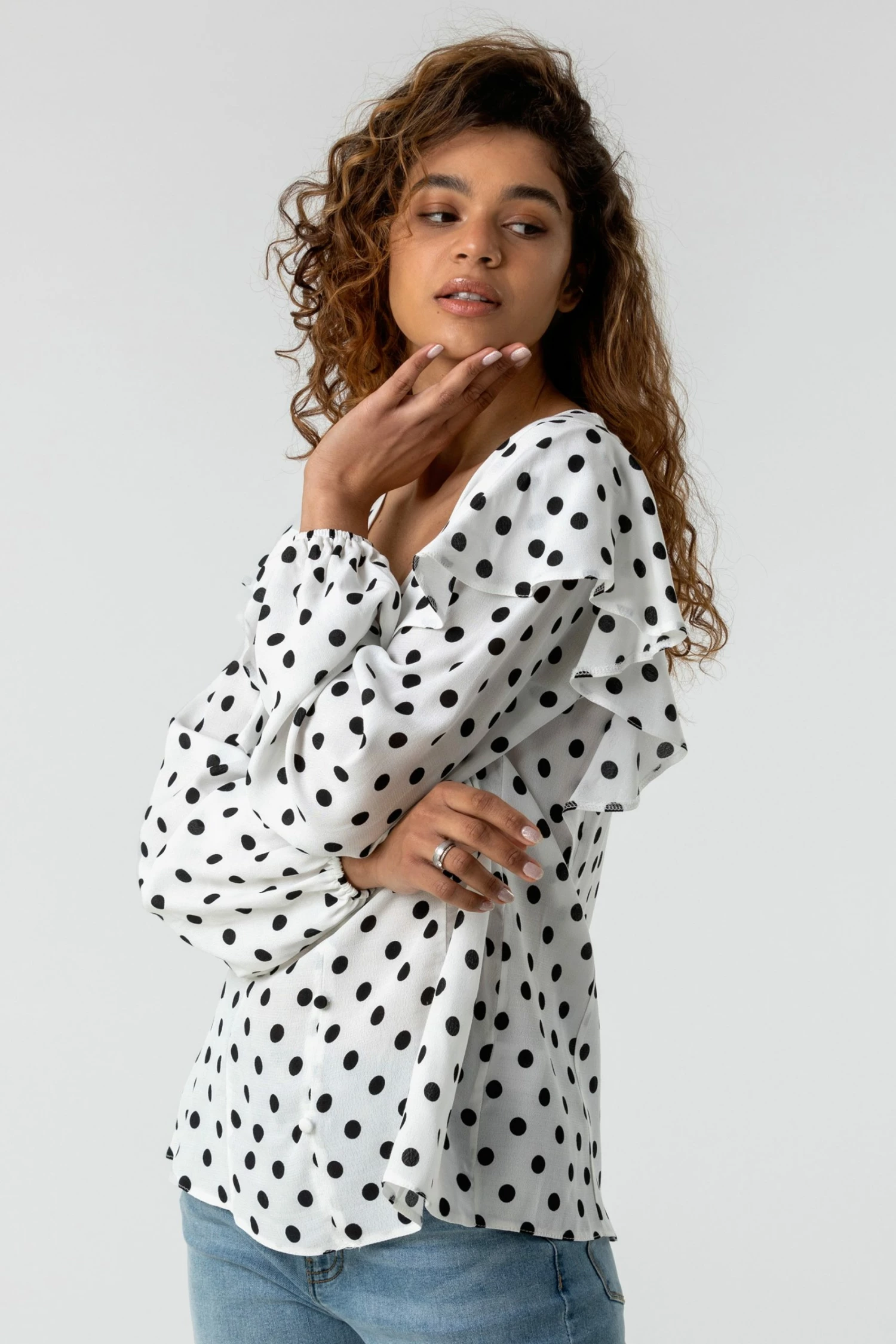 This Summer We’Re Providing Outfits For All The Fun! This Dot Print Shirt Is V-Necked And Embellished With A Fun Frill Detail At The Shoulder, Elasticated Cuff Sleeves And Black Buttons At The Centre Front. Keep Cool All Season In This Lightweight Woven Top And Pair It With Our White Cropped Stretch Trousers For A Look To Premier At Your Next Outdoor Gathering.