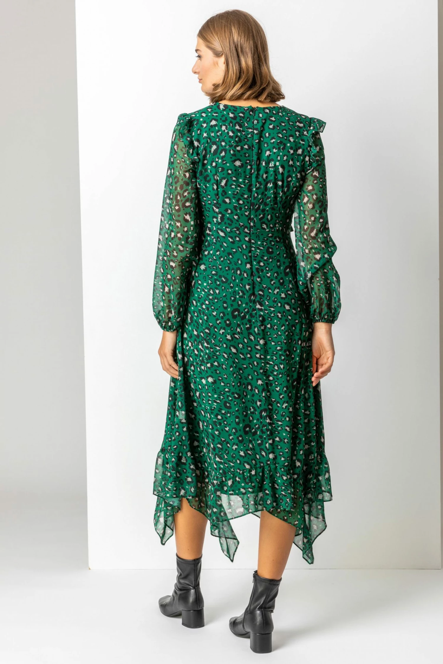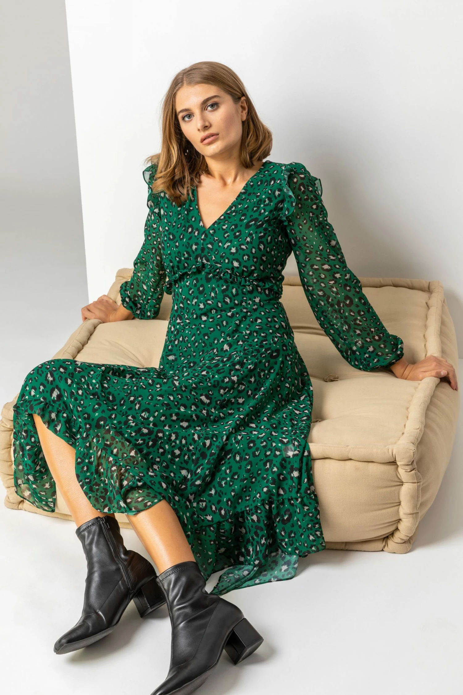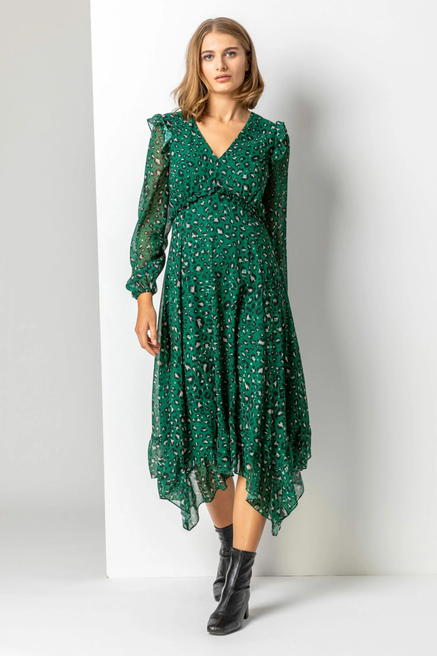 Make them go green with envy in this gorgeous animal print dress. Cut with a v-neckline and a ruffled waist, this floaty dress is finished with a hanky hemline and long sleeves with ruffle detailing at the shoulders. Team this leopard print dress with boots for chic autumnal style.