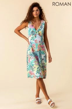 A tropical dream to transport you to somewhere hot and sunny, this tropical print dress has summer written all over it. Featuring a knotted tie detail at the bust and an all-over burnout print, this fit and flare dress is made from a jersey fabric making it easy to pull on over the head. Pair with your favourite sandals and a sun hat for a beach look to turn heads.