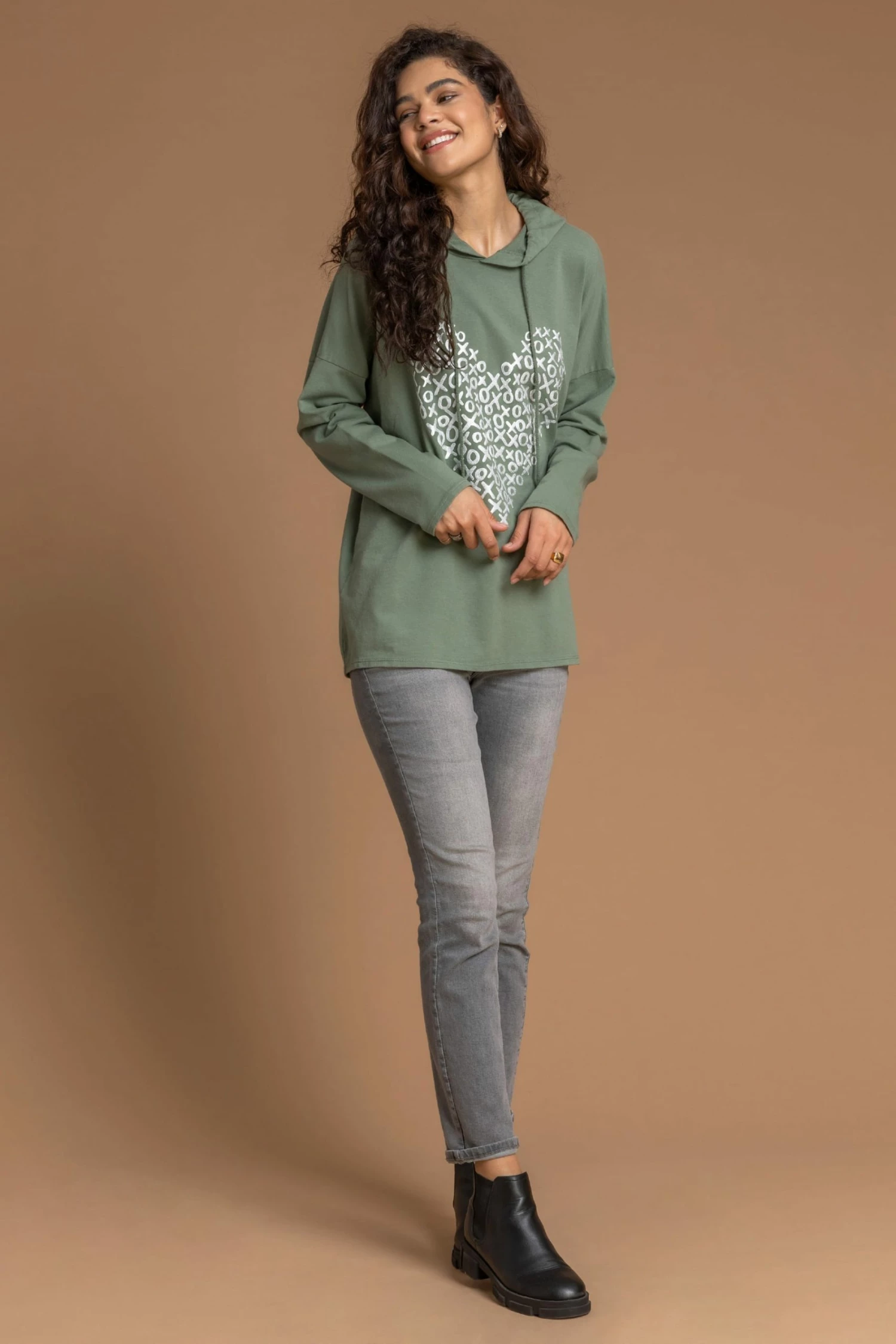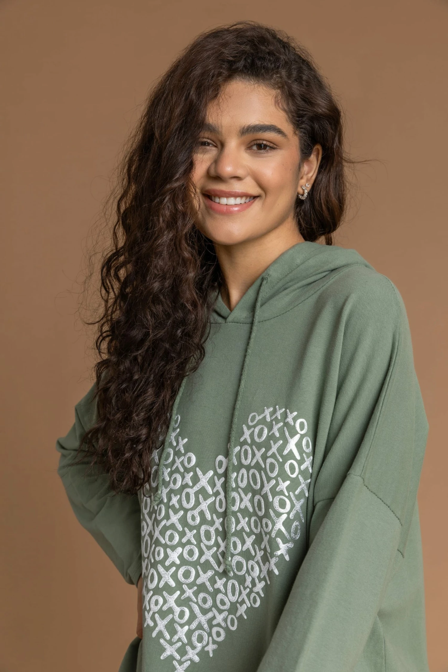 Love all day comfort in our long sleeve hooded lounge top. Adorned with a cute heart shaped foil print made up of kisses, this soft slouch drawsting sweat top will see you through relaxing evenings after a hard days work.