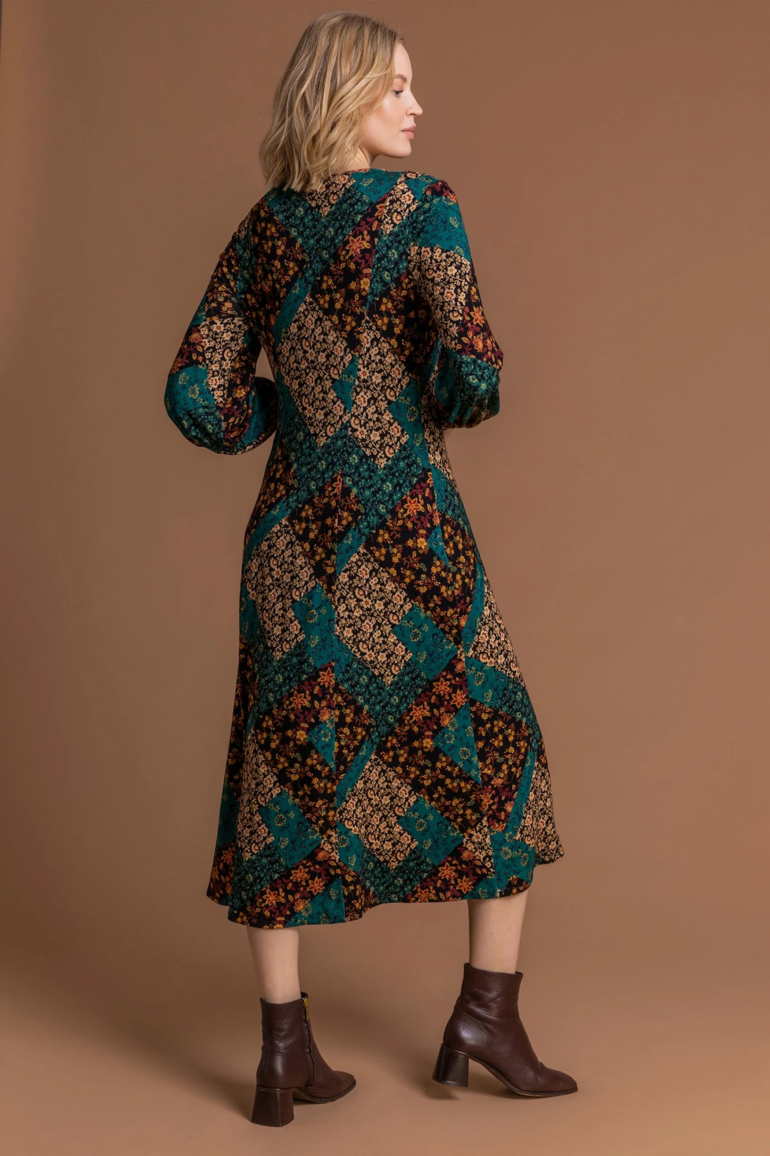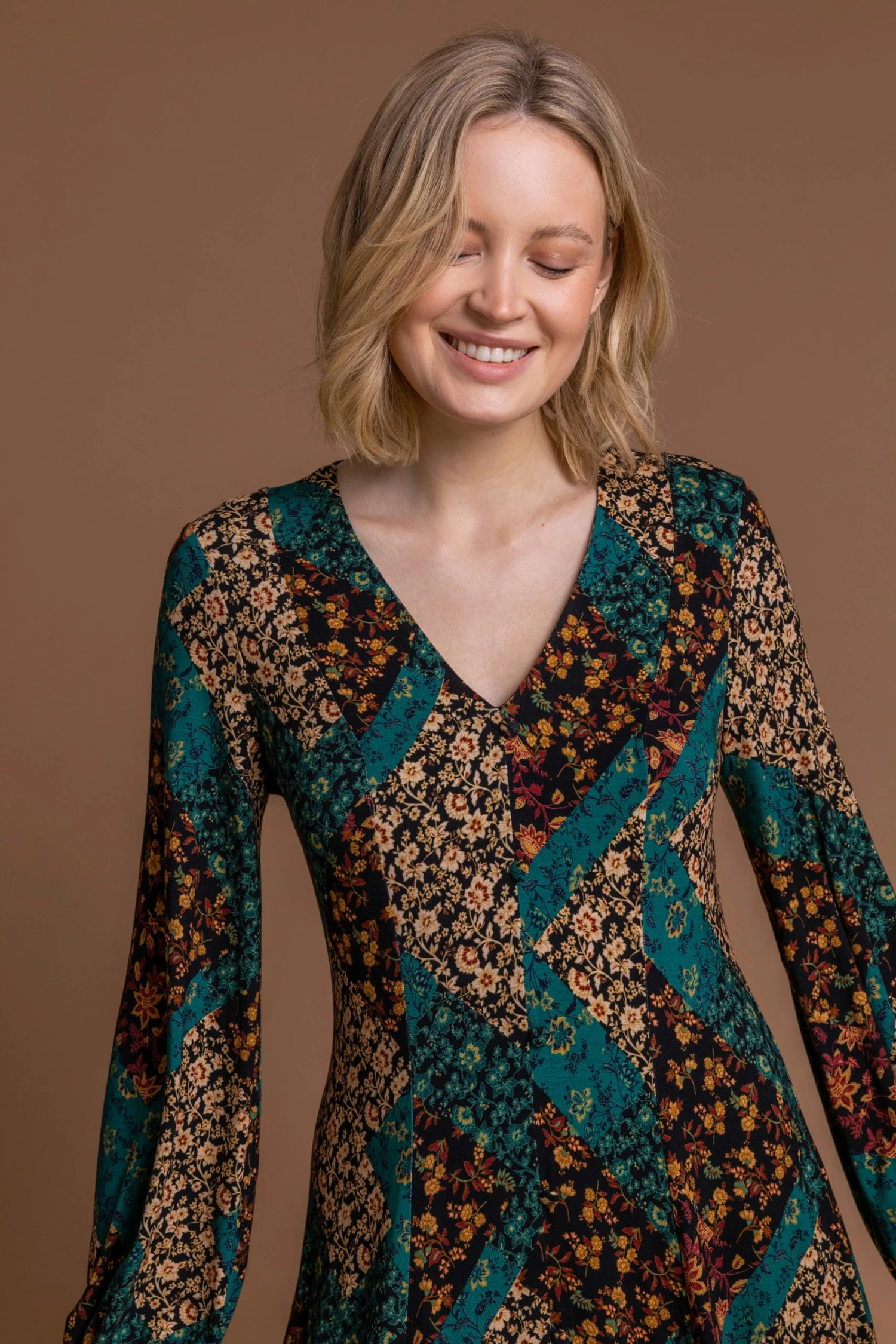 Our mystical midi gives us boho magic vibes all day long! With a unique floral patchwork print, this v-neck dress features a beautiful bell style long sleeve and is cut to a demure midi length. For extra comfort and ease, this timeless piece has elasticated cuffs and no fastenings. Add your favourite winter boots, tights and coat for an autumnal style or dress in a denim jacket and trainers to transition to spring.